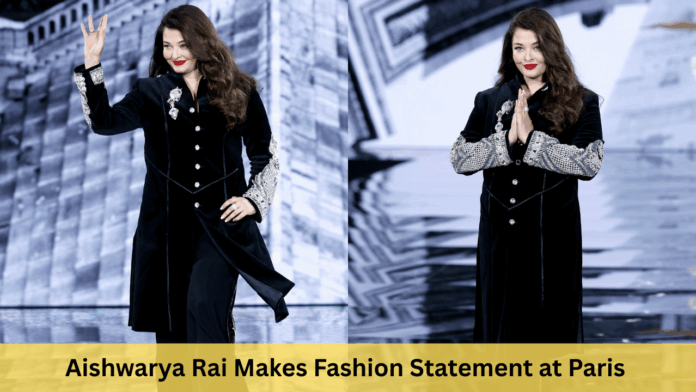 Aishwarya Rai stuns at Paris Fashion Week 2025 in a diamond-embellished sherwani by Manish Malhotra, blending traditional and contemporary fashion.