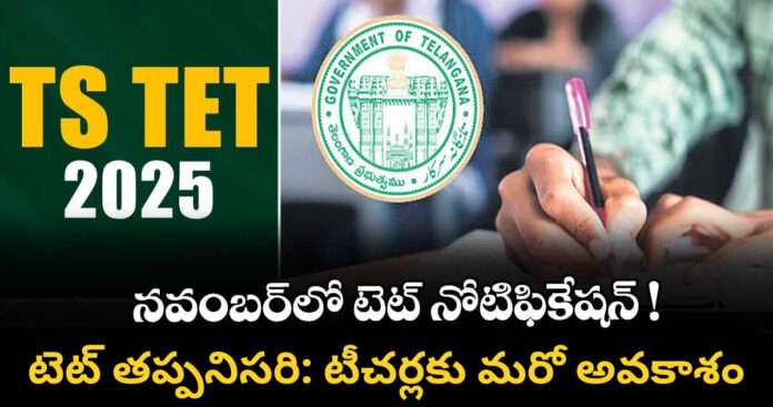 హైదరాబాద్: సుప్రీం కోర్టు తాజా తీర్పుతో టీచర్లకు టెట్ పరీక్ష రాసే అవకాశం కలిగింది. నవంబర్లో టెట్ నోటిఫికేషన్ విడుదల కానుందని విద్యాశాఖ వర్గాలు వెల్లడించాయి.