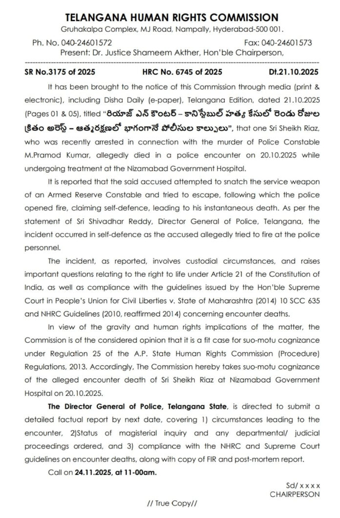 హైదరాబాద్: మీడియా కథనాల ఆధారంగా రియాజ్ ఎన్కౌంటర్ ఘటనను సుమోటోగా స్వీకరించిన తెలంగాణ మానవ హక్కుల సంఘం.