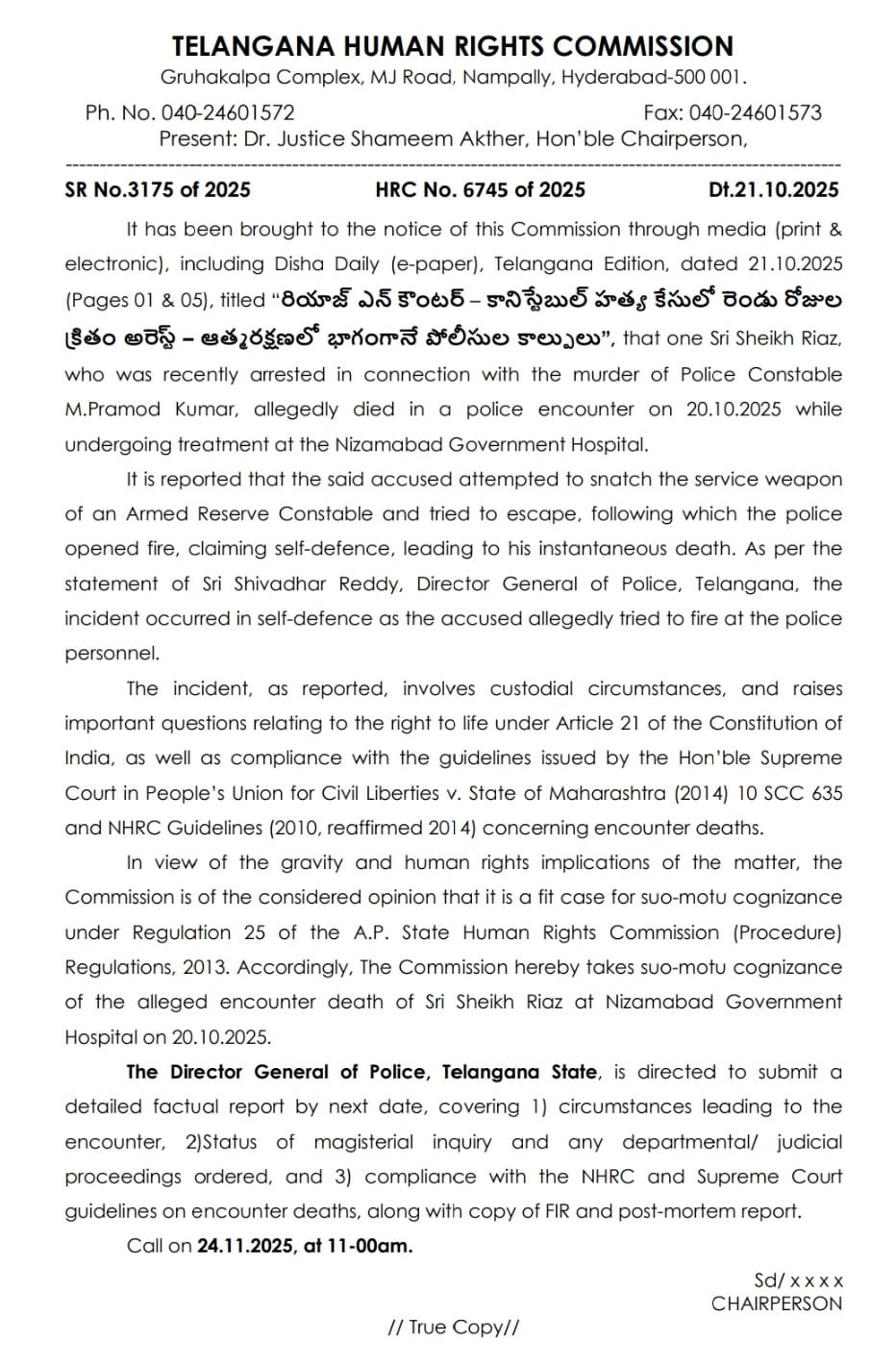 నవంబర్ 24లోగా ఘటనపై పూర్తి నివేదిక సమర్పించాలని రాష్ట్ర డీజీపీకి మానవ హక్కుల సంఘం ఆదేశాలు.