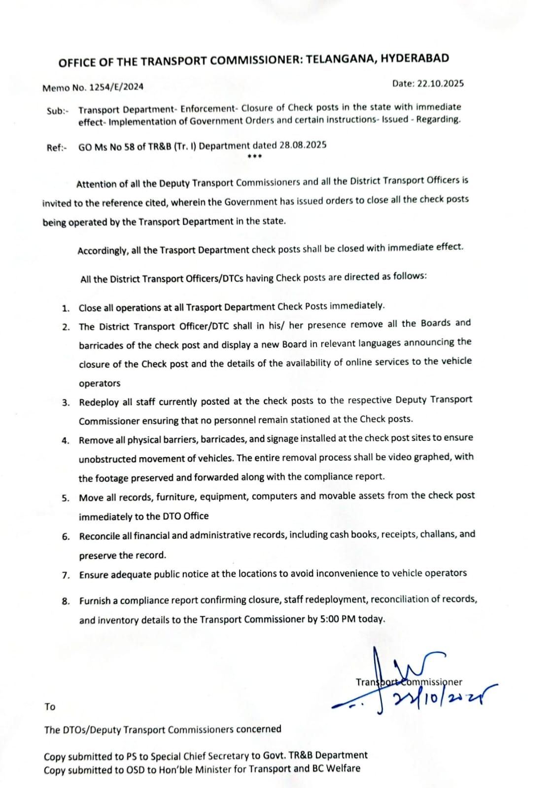 హైదరాబాద్ : అవినీతి జరుగుతున్న నేపథ్యంలో.. 22 వ తేది సాయంత్రం 5గంటల నుంచి తెలంగాణ రాష్ట్రంలోని అన్ని చెక్ పోస్టు లు రద్దు.
