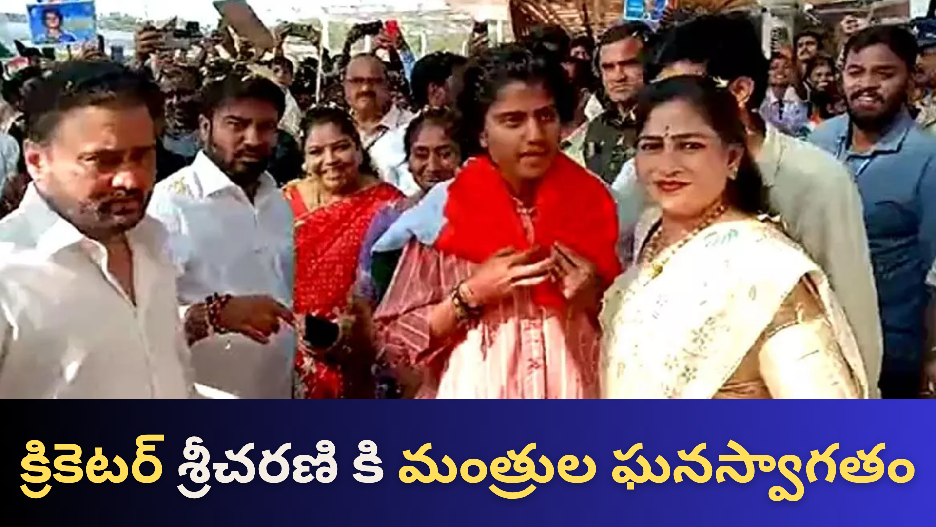 భారత మహిళా క్రికెటర్‌ శ్రీచరణి గన్నవరం విమానాశ్రయానికి చేరుకోగానే ఘన స్వాగతం లభించింది. మహిళా వన్డే వరల్డ్‌ కప్‌లో టీమ్‌ ఇండియాకు ప్రాతినిధ్యం వహించి విశ్వవిజేతగా నిలిచిన శ్రీచరణి విజయంతో తెలుగు రాష్ట్రాలు గర్వపడుతున్నాయి.