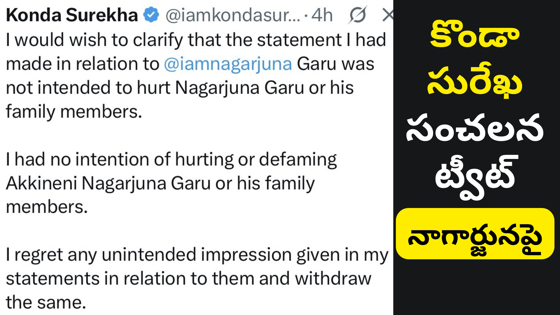 నందమూరి నాగార్జునతో సంబంధించిన రాజకీయ వివాదంపై ఆమె చేసిన ట్వీట్ సోషల్ మీడియాలో వైరల్ అయింది. ఈ ట్వీట్ కారణంగా రాజకీయ వర్గాల్లో చర్చలు ప్రారంభమయ్యాయి. కొండా సురేఖ తన అభిప్రాయాన్ని బహిరంగంగా వ్యక్తం చేయడం, పార్టీ అంతర్గత సమస్యలపై సమాజాన్ని అవగాహన చేసుకోవడం లక్ష్యంగా ఉందని విశ్లేషకులు పేర్కొంటున్నారు.