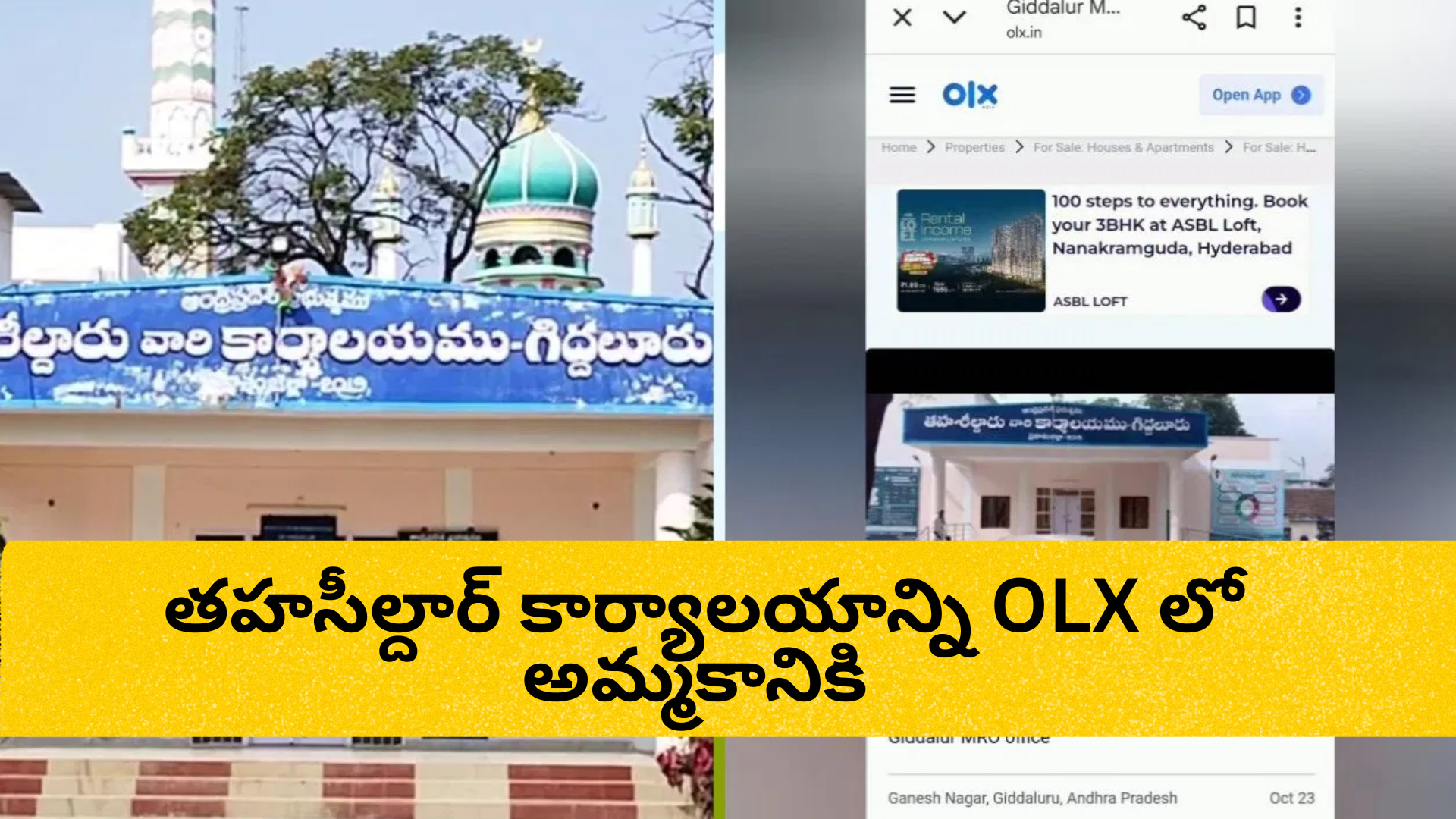 ప్రకాశంజిల్లా గిద్దలూరు తహసీల్దార్ కార్యాలయాన్ని OLXలో కేవలం రూ.20,000కే అమ్మకానికి ఉంచిన ఫోటో ఇప్పుడు వైరల్‌గా మారింది.