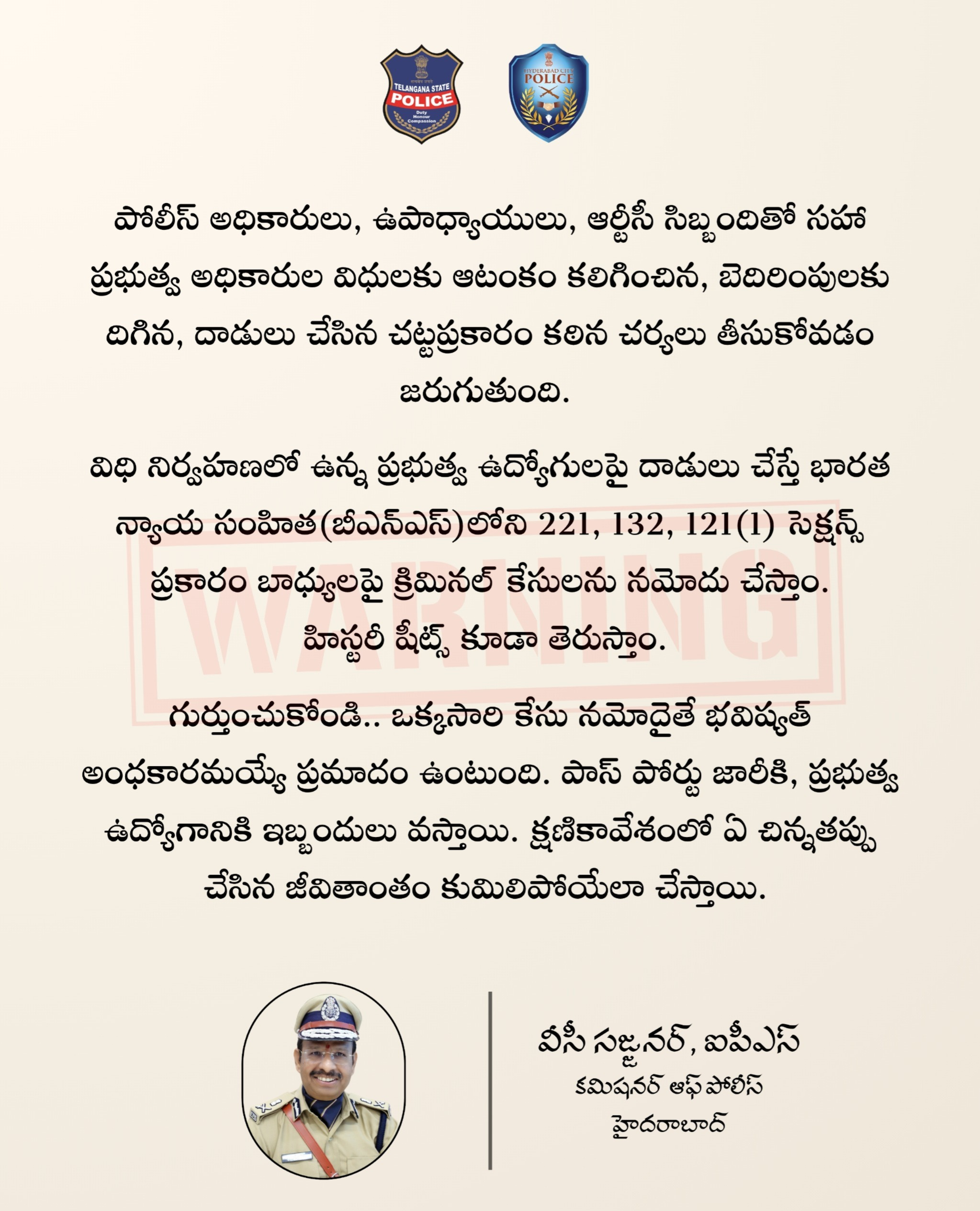 హైదరాబాద్ :  పోలీస్ అధికారులు, ఉపాధ్యాయులు, ఆర్టీసీ సిబ్బందితో సహా ప్రభుత్వ అధికారుల విధులకు ఆటంకం కలిగించిన, బెదిరింపులకు దిగిన, దాడులు చేసిన చట్టప్రకారం కఠిన చర్యలు తీసుకోవడం జరుగుతుంది.