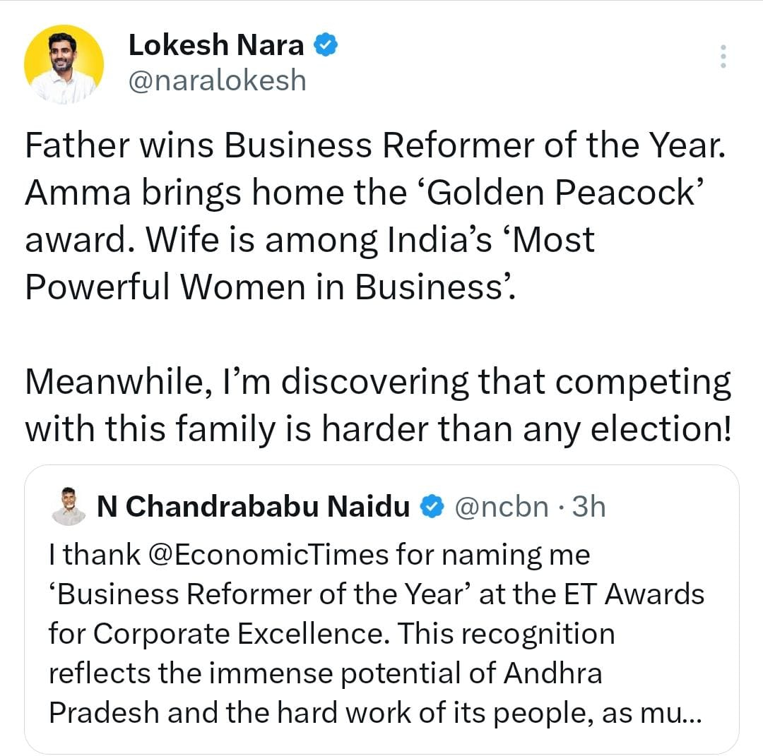 South ZoneAndhra Pradesh AP మంత్రి నారా లోకేష్ ఆసక్తికర ట్వీట్ | By Bharat Aawaz - 19 December 2025 0 0 Share FacebookTwitterWhatsAppLinkedinReddItPrintTelegramCopy URL ఏపీ మంత్రి నారా లోకేష్ ఆసక్తికర ట్వీట్… తన కుటుంబ సభ్యులకు అవార్డులు రావడంపై లోకేష్ ట్వీట్ ఎన్నికల్లో పోటీ చేయడం కంటే.. కుటుంబ సభ్యులతో పోటీ కష్టంగా ఉందన్న లోకేష్..