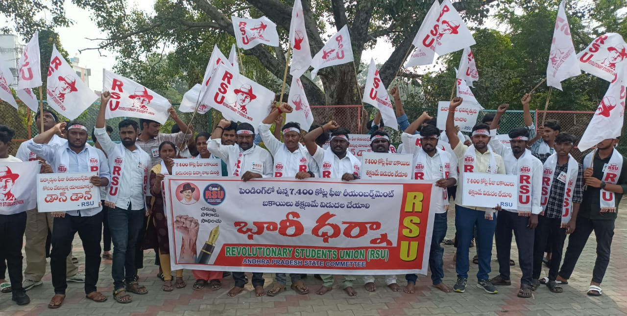 ఆంధ్రప్రదేశ్ రాష్ట్ర వ్యాప్తంగా పెండింగ్లో ఉన్న ఎస్సీ, ఎస్టీ, బీసీ, మైనారిటీ విద్యార్థుల ఫీజు బకాయిలు ₹7,400 కోట్లను తక్షణమే విడుదల చేయాలని విజయవాడ ధర్నా చౌక్లో రివల్యూషనరి విద్యార్థి సంఘం (RSU) ఆంధ్రప్రదేశ్ రాష్ట్ర కమిటీ ఆధ్వర్యంలో భారీ ఎత్తున ధర్నా నిర్వహించారు.
