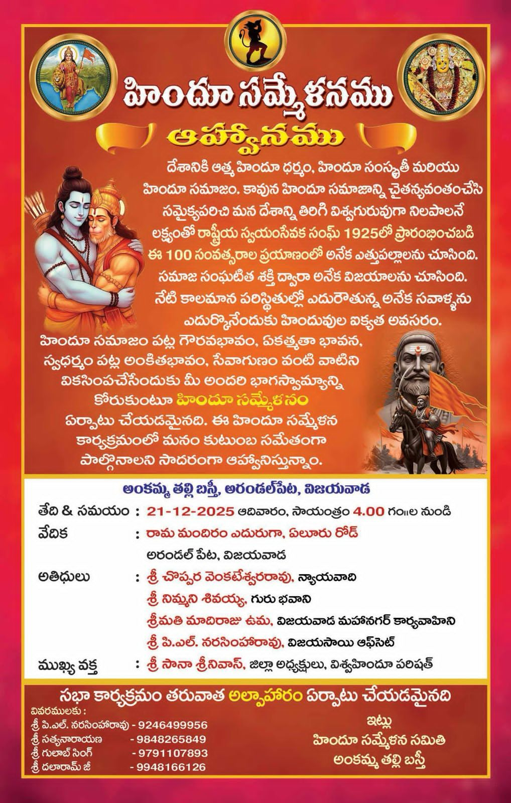 హిందూ సమ్మేళన సమితి ఆధ్వర్యంలో అరండల్ పేట అంకమ్మ తల్లి బస్తీలో హిందూ సమ్మేళనాన్ని నిర్వహించారు ఈ సమయంలో ప్రధాన వక్త గా పాల్గొన్న విశ్వహిందూ పరిషత్ జిల్లా అధ్యక్షుడు సానా శ్రీనివాస్ మాట్లాడుతూ హైందవ మతాన్ని బలహీనపరిచేందుకు శతాబ్దాలుగా సాగిన పాలకుల దుశ్చర్యలను ఖండించారు.