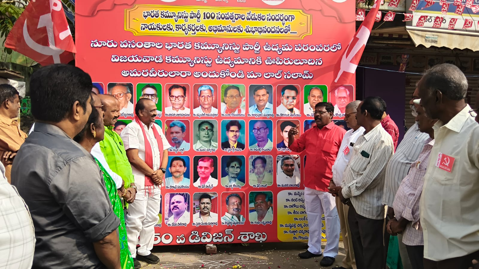 భారత కమ్యూనిస్టు పార్టీ ( సిపిఐ ) శతాబ్ది ఉత్సవాల ముగింపు సందర్భంగా పాతబస్తీ గొల్లపాలెం గట్టు 50 డివిజన్ లో ముగింపు వేడుకలు ఘనంగా జరిగాయి ఈ సందర్భంగా అమరవీరులను స్మరిస్తూ జరిగిన సభకు డివిజన్ పార్టీ కార్యదర్శి మోకా దుర్గారావు ఇలియాస్ చిన్న అధ్యక్షత వహించారు. ఈ సభకు ముఖ్యఅతిథిగా విచ్చేసిన సిపిఐ రాష్ట్ర కార్యవర్గ సభ్యులు ఎన్టీఆర్ జిల్లా కార్యదర్శి దోనేపూడి శంకర్ ప్రసంగిస్తూ భారత స్వతంత్ర సంగ్రామంలో ఇసుమంత పాత్రలేని సంఘపరివార శక్తులు దేశభక్తి గురించి మాట్లాడుతున్నారని ఎద్దేవా చేశారు.