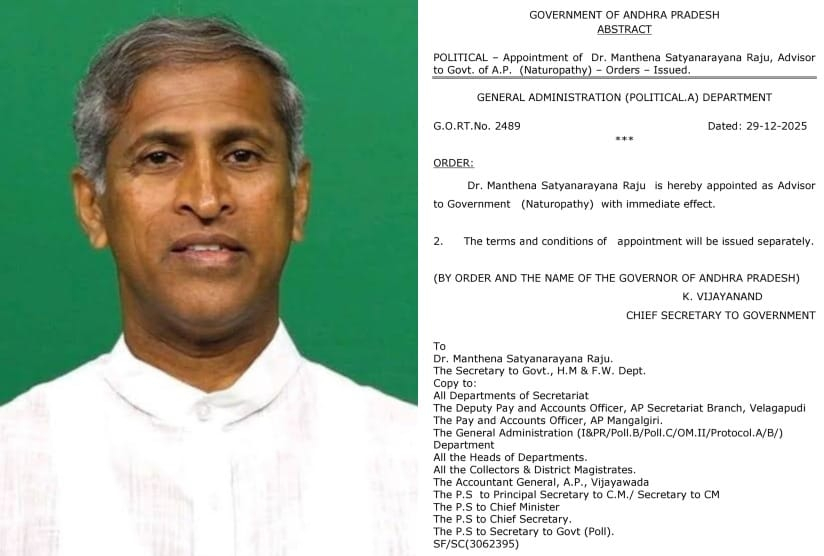 South ZoneAndhra Pradesh ఏపీ ఆరోగ్య సూచన సలహాదారుడిగా డాక్టర్ మంతెన సత్యనారాయణ By Bharat Aawaz - 30 December 2025 0 1 Share FacebookTwitterWhatsAppLinkedinReddItPrintTelegramCopy URL ఏపీ ప్రభుత్వ సలహాదారులుగా డా.మంతెన సత్యనారాయణ రాజు* ప్రముఖ ప్రకృతి వైద్య రంగ నిపుణులు డా.మంతెన సత్యనారాయణ రాజును ఏపీ ప్రభుత్వానికి ప్రకృతి వైద్య సలహాదారుగా (Advisor – Naturopathy) నియమిస్తూ ప్రభుత్వం ఉత్తర్వులు జారీ చేసింది.