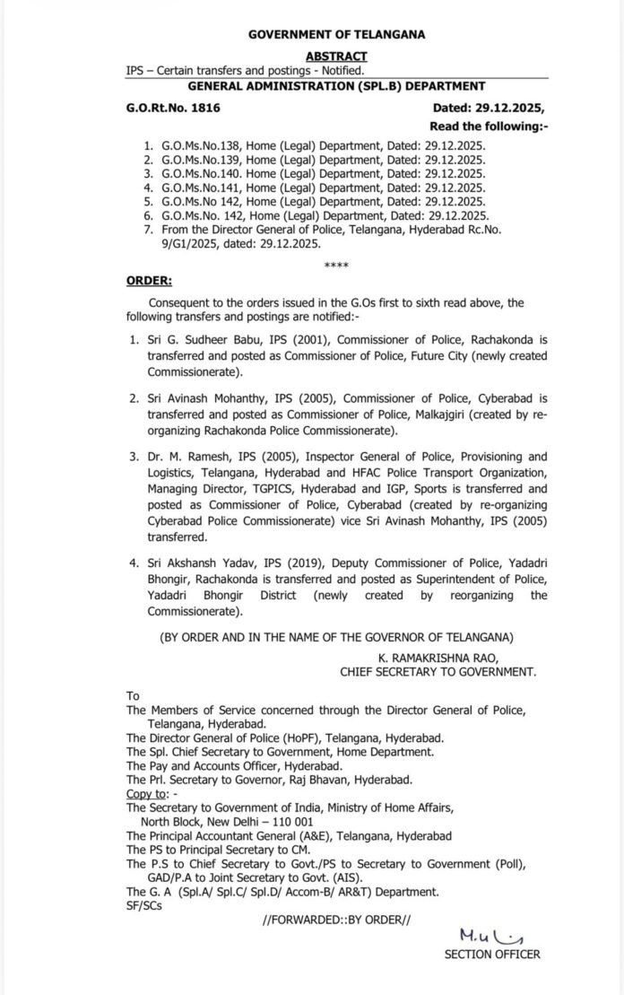 రాచకొండ కమిషనర్ సుధీర్ బాబుని ఫ్యూచర్ సిటీ కమిషనర్గా, సైబరాబాద్ కమిషనర్ అవినాష్ మొహంతిని మల్కాజిగిరి కమిషనర్గా, ప్రొవిషనింగ్ అండ్ లాజిస్టిక్స్ ఐజీ రమేష్ ను సైబరాబాద్ కమిషనర్గా, యాదాద్రి భువనగిరి డీసీపీ అక్షన్ష్ యాదవ్ ను, యాదాద్రి భువనగిరి జిల్లా ఎస్పీగా బదిలీ చేస్తూ ఉత్తర్వులు జారీ చేసిన తెలంగాణ ప్రభుత్వం.