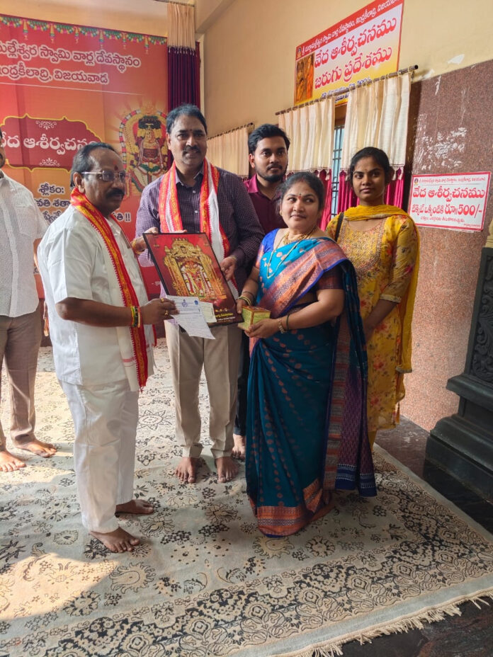 విరాళం అందించిన దాతలకు ఆలయ మర్యాదలతోపాటు, వేద పండితులచే వేద ఆశీర్వచనం అందజేశారు. అనంతరం, వారు అమ్మవారిని దర్శించుకుని, అమ్మవారి ఫోటో ప్రసాదం స్వీకరించారు.