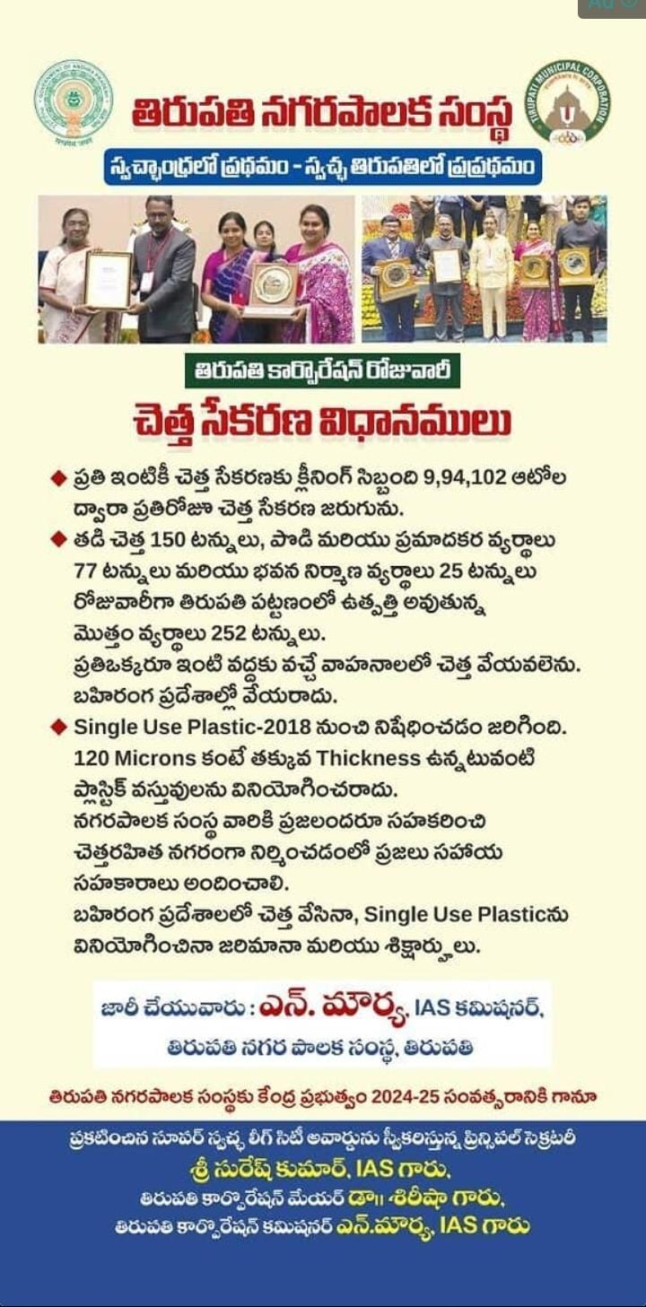 South ZoneAndhra Pradesh తిరుపతి నగరపాలక సంస్థ చెత్త సేకరణ | By Bharat Aawaz - 2 January 2026 0 Share FacebookTwitterWhatsAppLinkedinReddItPrintTelegram తిరుపతి నగరంలో చెత్త సేకరణ లో స్వచ్ఛాంద్ర లో ప్రప్రథమం -స్వచ్చ తిరుపతిలో ప్రప్రథమం.తిరుపతి నగర పాలక సంస్థ కమిషనర్ తెలిపారు.