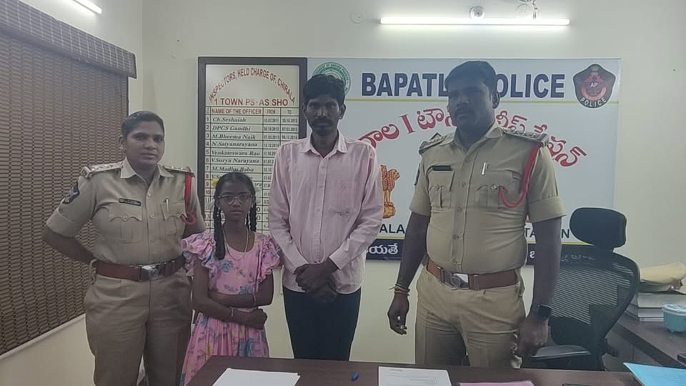తండ్రితోపాటు వేటపాలెం హాస్పిటల్ కు వచ్చిన 10 సంవత్సరముల పాప తప్పిపోయి వేటపాలెం నుండి చీరాల వైపు నడిచి వెళుతున్న క్రమంలో నిస్సహాయ స్థితిలో ఉన్న పాపను గుర్తించి చీరాల ఒకటో పట్టణ పోలీస్ స్టేషన్ అప్పగించడం జరిగింది.