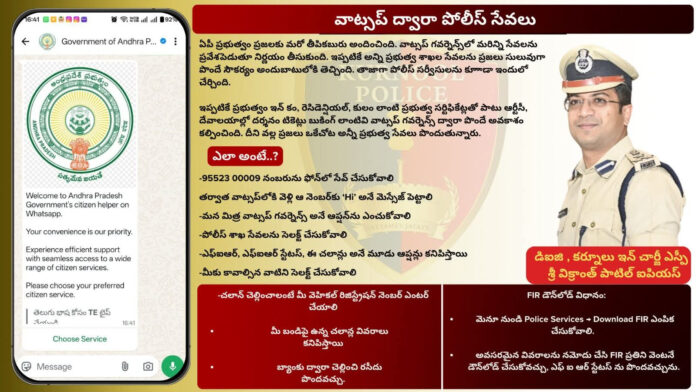 FIR డౌన్లోడ్ విధానం:* *ఫిర్యాదుదారు 95523 00009 నంబర్ను తన మొబైల్లో సేవ్ చేసి వాట్సాప్లో “Hi” పంపాలి.* *మెనూ నుండి Police Services → Download FIR ఎంపిక చేసుకోవాలి.* *అవసరమైన వివరాలను నమోదు చేసి FIR ప్రతిని వెంటనే డౌన్లోడ్ చేసుకోవచ్చు.* ఈ సేవల ద్వారా ప్రజలకు సమయం ఆదా కావడంతో పాటు, పోలీస్ సేవల్లో మరింత పారదర్శకత పెరుగుతుందని తెలిపారు. జిల్లా పరిధిలోని అన్ని పోలీస్ అధికారులు ఈ సేవపై ప్రజలకు అవగాహన కల్పించాలని ఆదేశించామని… ప్రజలు ఈ అవకాశాన్ని సద్వినియోగం చేసుకోవాలని డిఐజి, కర్నూలు జిల్లా ఇన్ చార్జీ ఎస్పీ శ్రీ విక్రాంత్ పాటిల్ ఐపియస్ గారు కోరారు.