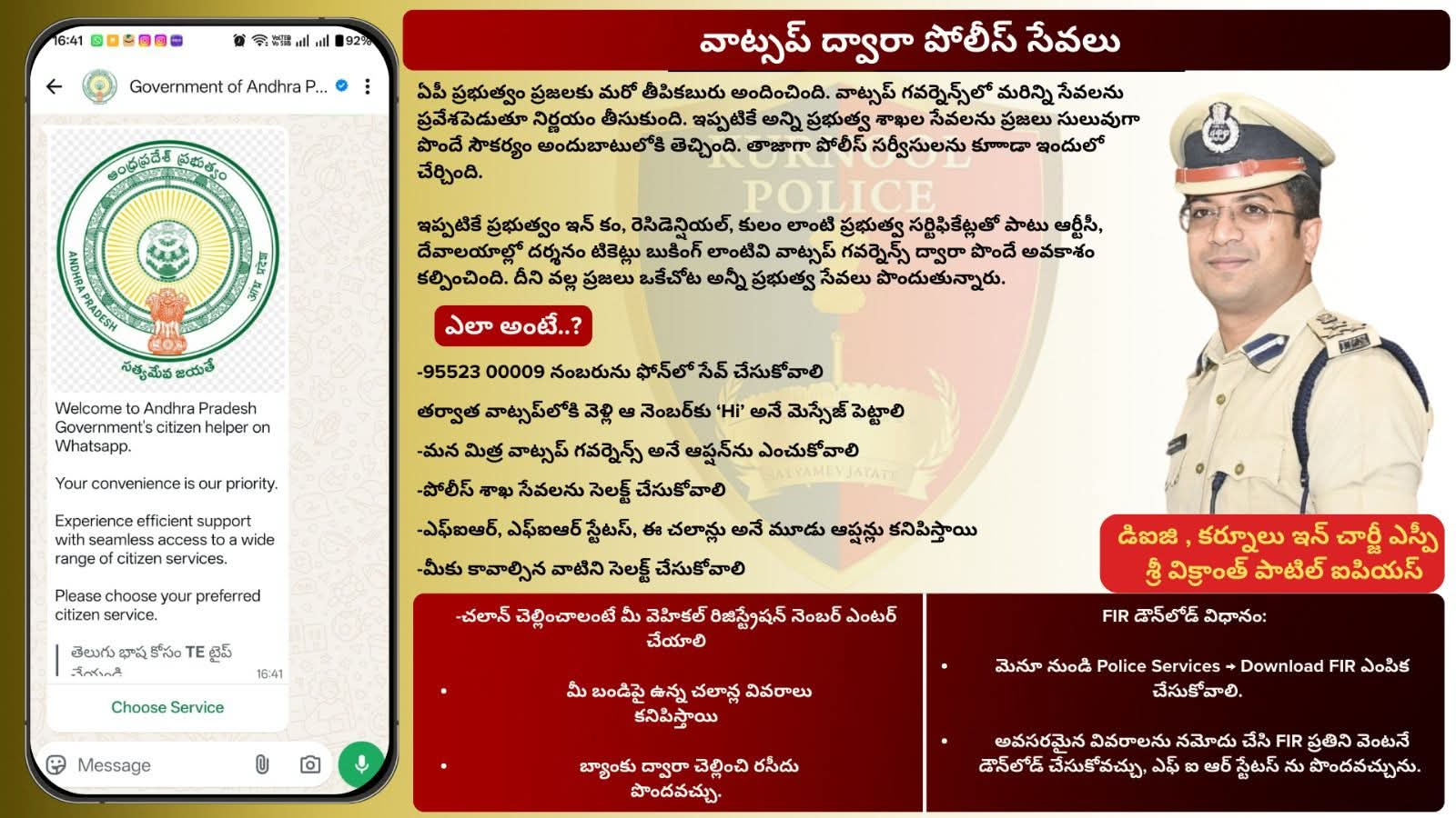 కర్నూలు జిల్లా ఇన్ చార్జీ ఎస్పీ శ్రీ విక్రాంత్ పాటిల్ ఐపియస్ గారు జిల్లా ప్రజలకు సోమవారం విజ్ఞప్తి చేశారు. గౌరవ రాష్ట్ర ముఖ్యమంత్రి గారి ఆదేశాల మేరకు…ప్రతి FIR నమోదు అనంతరం ఫిర్యాదుదారులు తమ FIR ప్రతిని పోలీస్ స్టేషన్కు రావాల్సిన అవసరం లేకుండా మన మిత్ర వాట్సాప్ గవర్నెన్స్ ద్వారా సులభంగా డౌన్లోడ్ చేసుకునే సౌకర్యం కల్పించడం జరిగిందన్నారు.