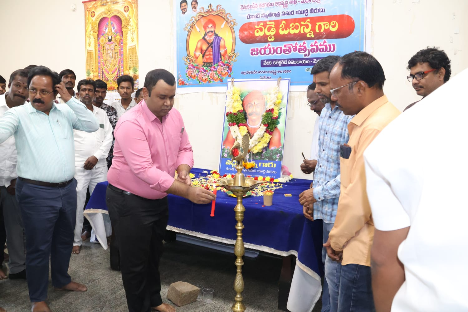 మెదక్ సమీకృత కలెక్టర్ కార్యాలయంలో వొడ్డె వొబన్న చిత్రపటానికి పూలమాలలు వేసి నివాళులు అర్పించిన రాహుల్ రాజ్ వారు మాట్లాడుతూ పీడిత ప్రజలు ఆరాధ్య దైవం ప్రజల సంక్షేమం కోసం తన జీవితాన్ని అంకితం చేసిన మహానుభావుడు వొడ్డె వొబన్న అని జిల్లా కలెక్టర్ రాహుల్ రాజ్ కొనియాడారు.