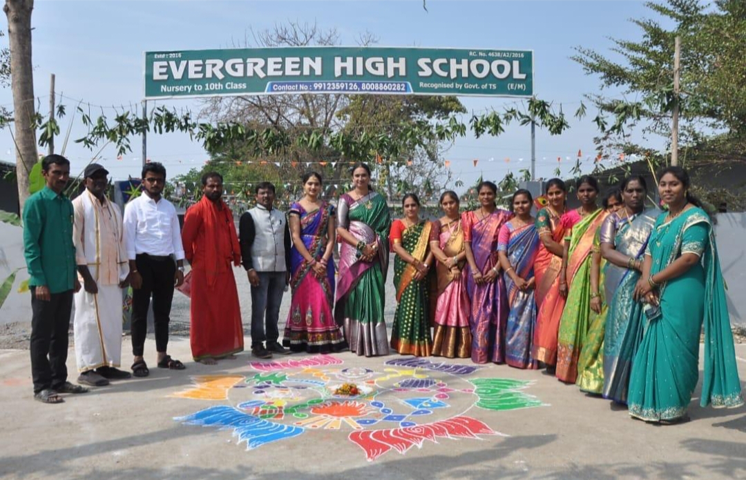 Sankranti celebrations were organized in Evergreen High School in Nelakondapally mandal of Khammam district. Muggula competitions were held to celebrate Sankranti. Milk pongals, chicken races, puppet shows.