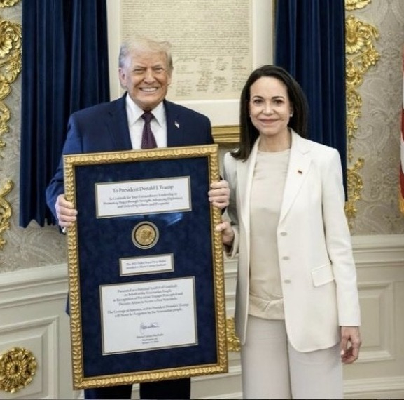 డొనాల్డ్ ట్రంప్ను కలిసిన వెనెజువెలా విపక్షనేత మరియా మచాడో, తనకు బహూకరించిన నోబెల్ పురస్కారం ట్రంప్నకు అందజేత, వెనెజువెలా భవిష్యత్పై ట్రంప్తో చర్చించా.