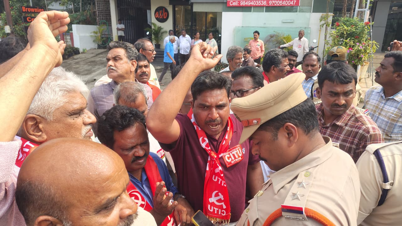 విజయవాడ: కేంద్ర ప్రభుత్వం అమలుపూనుకున్న లేబర్ కొడ్స్ రద్దు చేయాలని కేంద్ర కార్మిక సంఘాల మెరుపు నిరసన చేశారు. బుధవారం కేంద్ర లేబర్ మంత్రి, లేబర్ అధికారులు నగరంలోని రింగ్ రోడ్డులోని ఒక హోటల్ లో సమావేశమైయ్యారని సమాచారం అందింది. ఈ మేరకు కేంద్ర కార్మిక సంఘాలు సంయుక్తంగా హోటల్ ఎదుట నిరసన వ్యక్తం చేశారు. లేబర్ కొడ్స్ రద్దు చేయాలని, వాటిని వెనక్కి తీసుకోవాలని పెద్ద పెట్టున నినదించారు. కొద్దిసేపు పోలీసులకు, కార్మిక సంఘాల నాయకుల మధ్య తోపులాట జరిగింది.