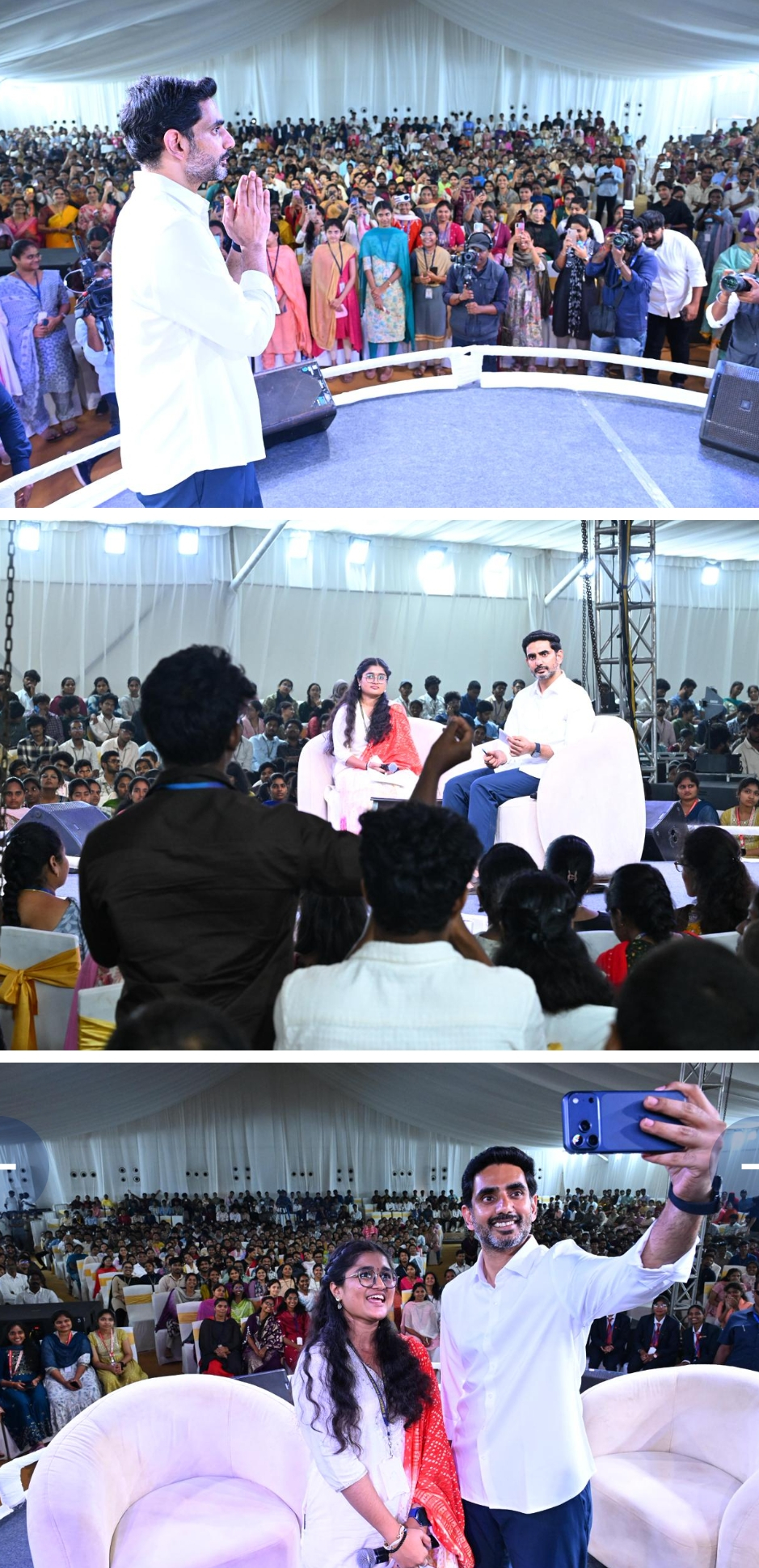 అనుబంధం, తన చదువు, ఇంటర్న్షిప్ అనుభవాలను పంచుకున్నారు. రాష్ట్రంలో పరిశ్రమల ఏర్పాటు, స్కిల్ డెవలప్మెంట్, ఉపాధి అవకాశాలపై కీలక హామీలు ఇచ్చారు. గోదావరి పుష్కరాలు, గ్రీన్ ఎనర్జీ, ఫార్మా రంగం అభివృద్ధిపై ప్రభుత్వ ప్రణాళికలను వివరించారు. వ్యక్తిగత జీవితం నుంచి రాష్ట్ర అభివృద్ధి వరకు అనేక అంశాలపై విద్యార్థులు అడిగిన సందేహాలను ఆయన నివృత్తి చేశారు. జేఎన్టీయూ ఈసీఈ మూడో సంవత్సరం విద్యార్థిని ప్రాప్తి ఈ కార్యక్రమానికి యాంకర్ గా వ్యవహరించారు.
