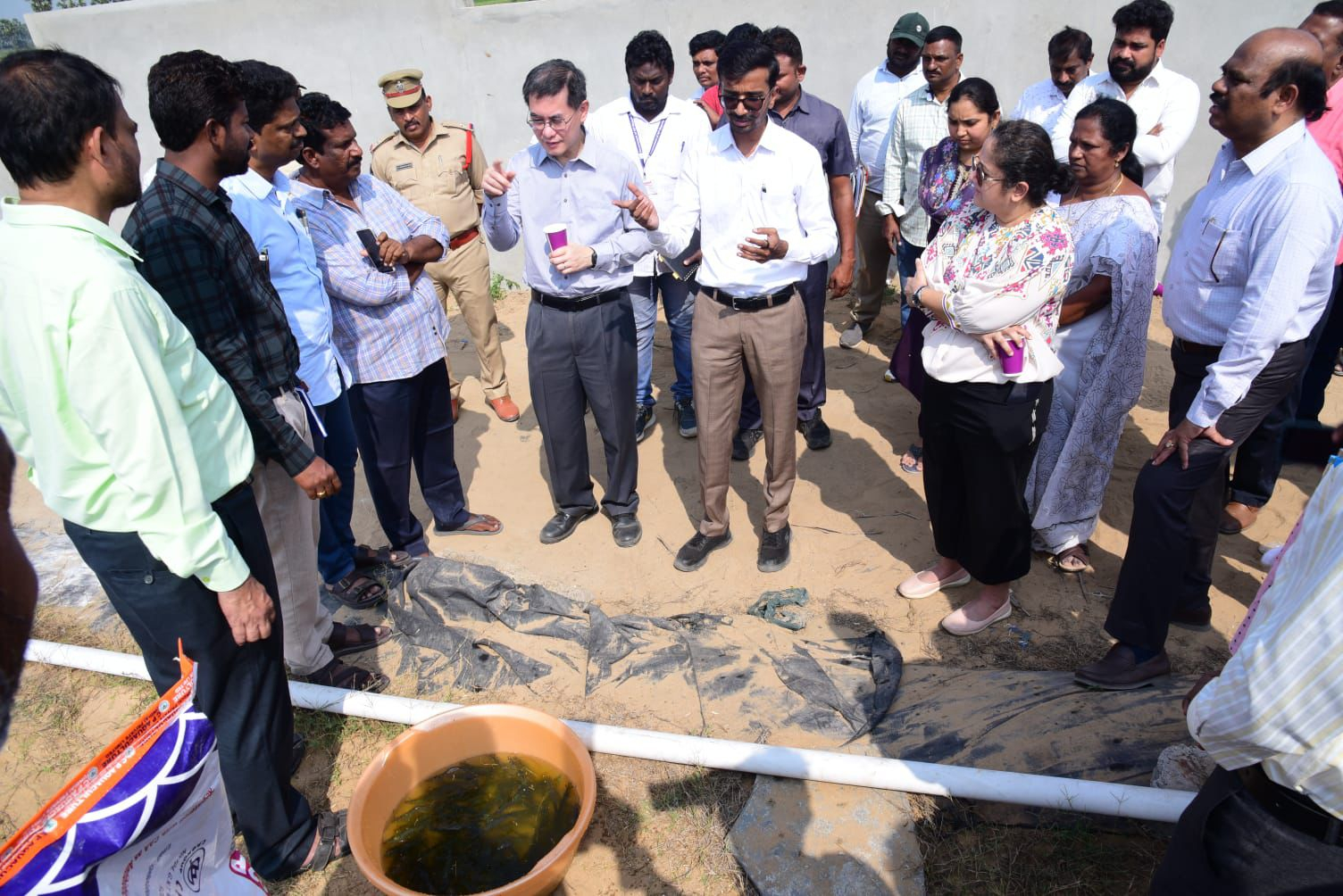 బయో ఫ్లాగ్ టెక్నాలజీతో చేపట్టిన రొయ్యల సాగు యూనిట్ ను కలెక్టర్, సింగపూర్ అధికారుల బృందం పరిశీలించింది. అడవి పంచాయతీలో సురేష్ అనే ఆక్వా రైతు 5 ఎకరాలలో ప్రారంభించిన రొయ్యల సాగు పరిశ్రమను బృందం పరిశీలించింది. పర్యావరణానికి ఎలాంటి హాని లేని బయో ఫ్లాగ్ టెక్నాలజీతో నూట ఇరవై మిలియన్ రొయ్య పిల్లల ఉత్పత్తి ఒకేసారి చేపట్టడం అభినందనీయమని దక్షిణాసియా మిడ్డిల్ ఈస్ట్ అండ్ ఆఫ్రికా, సింగపూర్ మినిస్ట్రీ ఆఫ్ ట్రేడ్ అండ్ ఇండస్ట్రీ సీనియర్ డైరెక్టర్ డాక్టర్ ఫ్రాన్సిస్ చాంగ్ తెలిపారు. సదరు రైతు సురేష్ తో సింగపూర్ అధికారులు మాట్లాడారు. ఈ సాగు వల్ల లాభనష్టాలను అడిగి తెలుసుకున్నారు. పర్యావరణ పరిరక్షణ, అధిక