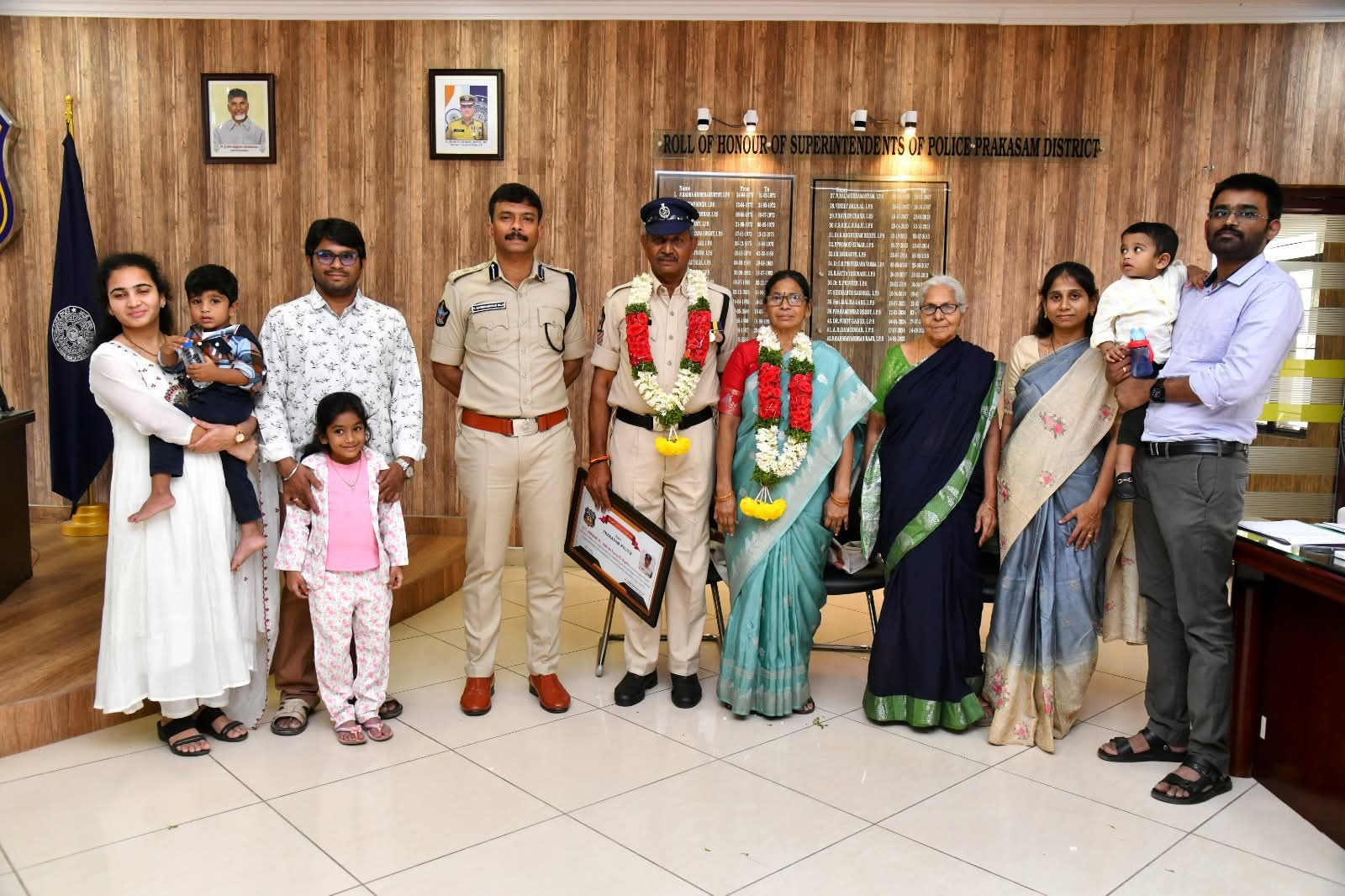 సుదీర్ఘ సేవలందించి ఉద్యోగ విరమణ పొందిన హెడ్ కానిస్టేబుల్ ను సన్మానించి అత్మీయ వీడ్కోలు పలికిన ప్రకాశం జిల్లా ఎస్పీ శ్రీ వి.హర్షవర్ధన్ రాజు, ఐపీఎస్.,గారు