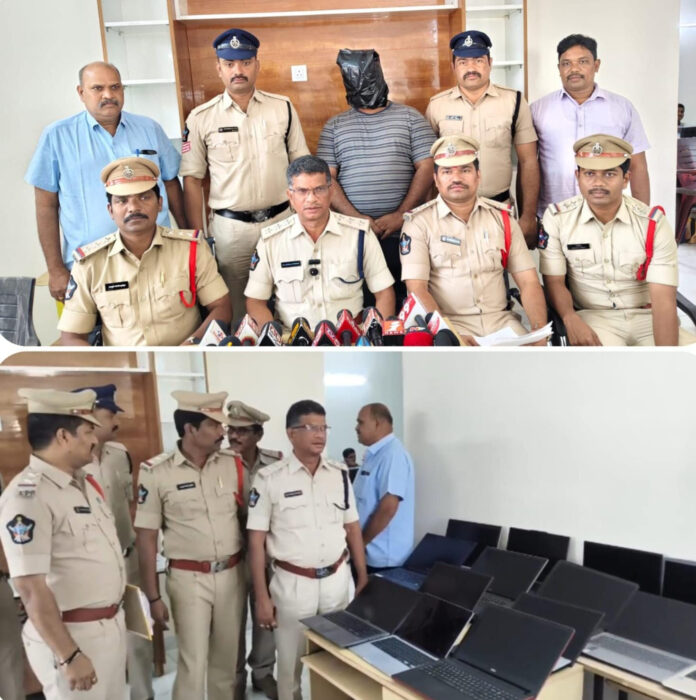 విశ్వవిద్యాలయాలు, జాతీయ స్థాయి విద్యాసంస్థలు, వైద్య కళాశాలల బాలుర వసతి గృహాలను లక్ష్యంగా చేసుకుని ల్యాప్టాప్ దొంగతనాలకు పాల్పడుతున్న ఒక అంతరాష్ట్ర నిందితుడిని మంగళగిరి గ్రామీణ పోలీసులు అరెస్ట్ చేసినట్లు నార్త్ సబ్ డివిజన్ డిఎస్పి మురళీకృష్ణ తెలిపారు.గురువారం మంగళగిరి పట్టణంలోని డీఎస్పీ కార్యాలయంలో ఏర్పాటు చేసిన మీడియా సమావేశంలో ఆయన మాట్లాడుతూ లా చదివి ల్యాప్ టాప్ లు దొంగతనాలకు పాల్పడుతున్న అంతర్రాష్ట్ర నిందితుడిని అరెస్ట్ చేసినట్లు ఆయన చెప్పారు. అమృత విశ్వవిద్యాపీఠం సీనియర్ వార్డెన్ మోహనకృష్ణ ఫిర్యాదు మేరకు మంగళగిరి గ్రామీణ పోలీస్ స్టేషన్లో కేసు నమోదు చేసి, గ్రామీణ సీఐ ఏ.వి. బ్రహ్మం, గ్రామీణ ఎస్సై చిరుమామిళ్ల వెంకట్ ఆధ్వర్యంలో దర్యాప్తు చేపట్టినట్లు తెలిపారు..అతని వద్ద నుంచి మొత్తం 15 ల్యాప్టాప్లు స్వాధీనం చేసుకున్నట్లు మురళీకృష్ణ వెల్లడించారు. వీటి అంచనా విలువ సుమారు రూ.12 లక్షలుగా