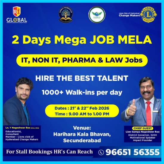 The Mega Impact 2026 event is hosting a major Job Mela at Hari Hara Kala Bhavan, Secunderabad, on February 21st and 22nd. Organized by the Impact Foundation, the event runs from 9:00 AM to 9:00 PM.