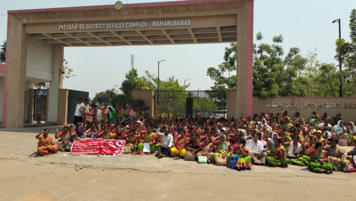 ఈరోజు అంగన్వా డి టీచర్స్ అండ్ హెల్పర్స్ సమస్యలు పరిష్కరించాలని కలెక్టర్ ఆఫీస్ ఆఫీస్ ముందు ఏడు వందల మందితో మూడు గంటల పాటు ధర్నా జరిగింది అనంతరం కలెక్టర్ గారికి సమస్యలతో కూడిన వినతి పత్రం ఇవ్వడం జరిగింది. ఈ సందర్భంగా సమ్మెట రాజ మౌళి స్నేహబిందు మాట్లాడుతూ తెలంగాణ రాష్ట్రంలో 70 వేల మంది అంగన్వాడి టీచర్స్ హెల్పర్స్ 50 సంవత్సరాల నుండి పేద ప్రజలకు సేవలు అందిస్తున్నారు. వీరంతా మహిళలు బడుగు బలహీన వర్గాలకు చెందిన వారు అత్యధికులు ఉన్నారు. నేటికీ వీరికి ఎలాంటి చట్టబద్ధ సౌకర్యాలు లేక అనేక ఇబ్బందులు ఎదుర్కొంటున్నారు. ఈ సమస్యల పరిష్కారం కోసం అసెంబ్లీ సమావేశాలలో మాట్లాడాలని ఎమ్మెల్యేలకు మంత్రులకు వినతి పత్రాలు ఇవ్వడం జరిగింది. చివరికి చలో హైదరాబాద్ వేలాదిమంది తరలి వెళ్లారు. పోలీసులు అరెస్టులు చేయడం నిర్బంధించడం అక్రమంగా కేసులు పెట్టడం జరిగింది. అయినా రాష్ట్ర ప్రభుత్వం స్పందించకపోవడంతో రాష్ట్ర కమిటీ అంగన్వాడీ పిలుపులో భాగంగా కలెక్టర్ ఆఫీస్ ముందు 700 మందితో ధర్నా చేయడం జరిగింది. కనీస వేతనములు 26000 ఇవ్వాలని ఎడ్యుకేషన్ పాలసీని సవరించాలి ఫ్రీ పై మరి విద్యను అంగన్వాడీ కేంద్రాలలోనే నిర్వహించాలి టీచర్స్ హెల్పర్స్ ఇద్దరికీ ఒకేసారి మే నెల అంతా సెలవులు అమలు చేయాలని డిమాండ్ చేశారు. ఈ కార్యక్రమంలో జిల్లా ఉపాధ్యక్షులు కుమ్మరి కుంట్ల నాగన్న. వాసం దుర్గారావు. పగిడి పాల తిరుపతమ్మ. గుండు సులోచన. కుమ్మరి కుంట్ల జ్యోతి. సమ్మెట లలిత. ఏ ఉమా. కే సంధ్య. ఆర్ మల్లికాంబ. తదితరులు పాల్గొన్నారు.