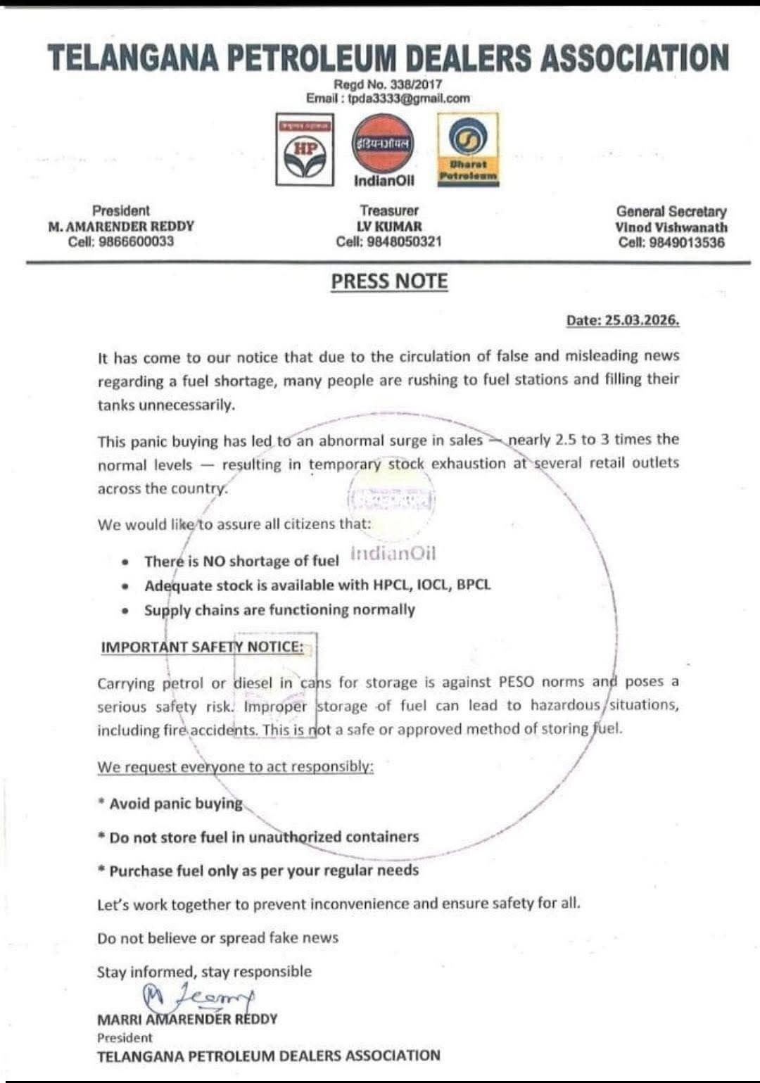 అనధికారిక కంటైనర్లు లేదా క్యాన్లలో పెట్రోల్, డీజిల్ నిల్వ చేయడం PESO నిబంధనలకు విరుద్ధమని అసోసియేషన్ హెచ్చరించింది.