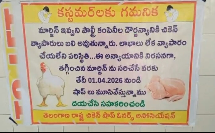 పౌల్ట్రీ కంపెనీల మొండివైఖరి మరియు తగ్గుతున్న లాభాల మార్జిన్లకు నిరసనగా, వచ్చే నెల ఏప్రిల్ 1, 2026 నుండి రాష్ట్రవ్యాప్తంగా చికెన్ షాపులను నిరవధికంగా మూసివేస్తున్నట్లు తెలంగాణ రాష్ట్ర చికెన్ షాప్ ఓనర్స్ అసోసియేషన్ ప్రకటించింది.
