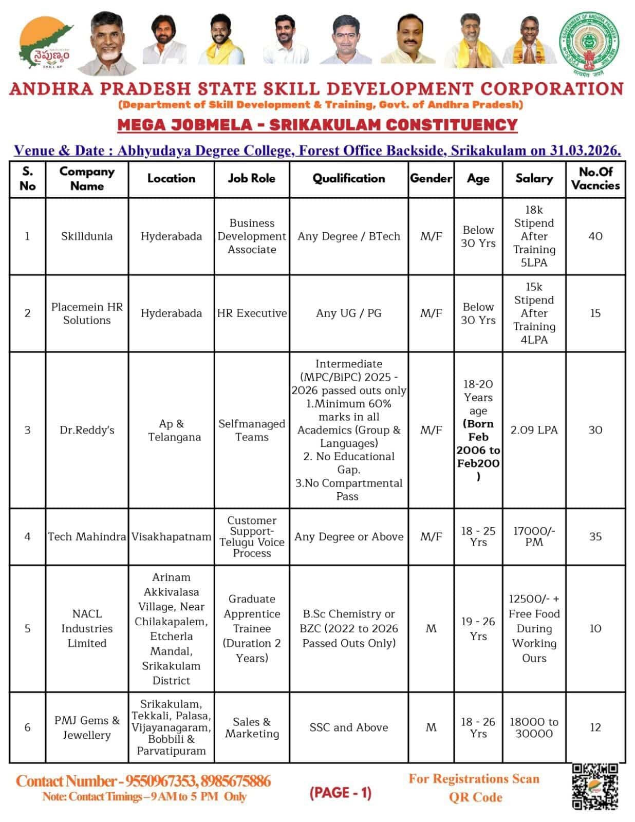 శ్రీకాకుళం పాతబస్టాండ్‌: ఆంధ్రప్రదేశ్‌ రాష్ట్ర నైపుణ్యాభివృద్ధి సంస్థ ఆధ్వర్యంలో శ్రీకాకుళంలోని అభ్యుదయ డిగ్రీ కళాశాల ప్రాంగణంలో ఈ నెల 31న ఉదయం 9 గంటల నుంచి జాబ్‌మేళా నిర్వహించనున్నట్లు కలెక్టర్‌ స్వప్నిల్‌ దినకర్‌ పుండ్కర్‌ బుధవారం తెలిపారు. టెక్‌ మహీంద్రా, డాక్టర్‌ రెడ్డీస్‌, స్కిల్‌ దునియా, ప్రెస్‌మీన్‌ హెచ్‌ఆర్‌ సొల్యూషన్స్‌, నాగార్జున అగ్రికెమ్‌, కాన్సెంట్రిక్స్‌ ఫార్మా, పీఎంజే జ్యూయలరీ, జాయ్‌ అలుక్కాస్‌, డెక్కన్‌ కెమికల్‌, ఐ స్మార్ట్‌ సొల్యూషన్‌ వంటి ప్రముఖ సంస్థలు పాల్గొని 500పైగా ఉద్యోగాలు కల్పిస్తాయని వివరించారు. టెన్త్‌, ఇంటర్మీడియట్‌, ఐటీఐ, డిప్లమో, బీటెక్‌, ఎంబీఏ, డిగ్రీ, ఎమ్మెస్సీ కెమిస్ట్రీ చదివిన 18 నుంచి 30 ఏళ్ల నిరుద్యోగ యువతీ యువకులు అర్హులని పేర్కొన్నారు. ఎంపికైన వారు శ్రీకాకుళం, విశాఖపట్నం, శ్రీసిటీ నెల్లూరు, హైదరాబాద్‌లలో పనిచేయాల్సి ఉంటుందన్నారు. అభ్యర్థులు naipunyam.ap.gov.in వెబ్‌సైట్‌లో రిజిస్ట్రేషన్‌ చేసుకోవాలన్నారు. జిల్లా నైపుణ్యాభివృద్ధి అధికా రి ఉరిటి సాయికుమార్‌ మాట్లాడుతూ రిజిస్ట్రేషన్‌ రిఫరెన్స్‌ నంబర్‌, బయోడేటా, ఆధార్‌, విద్యార్హతల ఒరిజినల్‌, జెరాక్స్‌ కాపీలు, పాస్‌పోర్ట్‌ సైజు ఫొ టోతో కలిసి ఉదయం 9 గంటలకు జాబ్‌మేళా ప్రాంగణానికి హాజరుకావాలని, వివరాలకు 95509 67353 నంబర్‌ను సంప్రదించాలని కోరారు.
