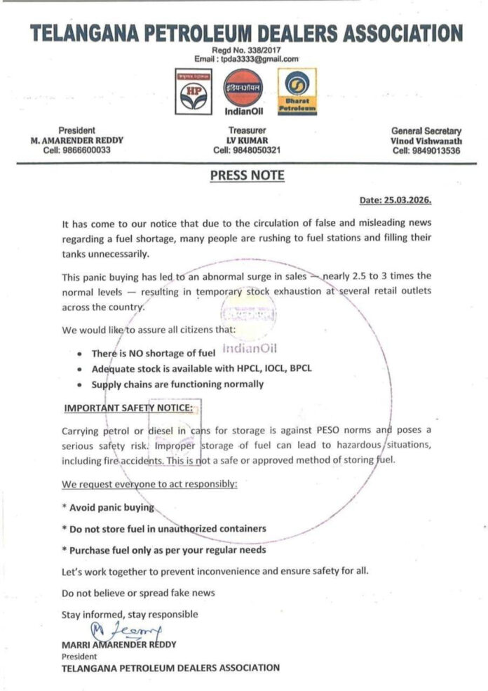 ఆయిల్ కంపెనీలు సాధారణంగా సరఫరా కొనసాగిస్తున్నాయని స్పష్టం చేశాయి. ప్రజలు ఈ రకాల వదంతులను నమ్మకుండా, అవసరానికి మించి ఇంధనం నిల్వ చేయకుండా సహకరించాలి. తప్పుడు వార్తలను పంచేవారిపై చట్టపరమైన చర్యలు తీసుకుంటామని అధికారులు హెచ్చరించారు. నిజమైన సమాచారానికి మాత్రమే ప్రాధాన్యం ఇవ్వాలి