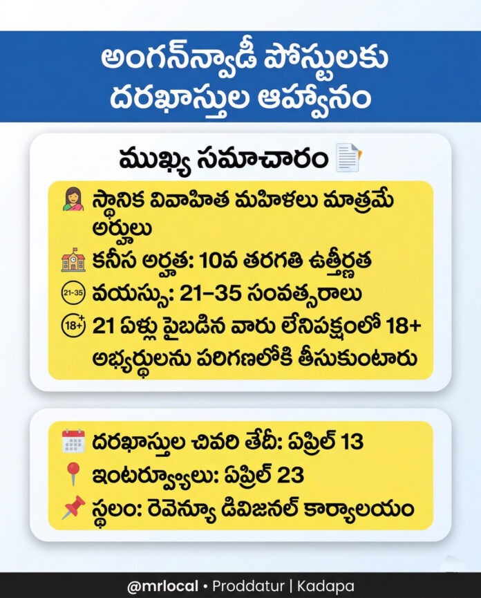 వైఎస్ఆర్ కడప జిల్లాలోని పలు మండలాల్లో అంగన్వాడీ వర్కర్ మరియు హెల్పర్ పోస్టుల భర్తీకి దరఖాస్తులు కోరడమైనది.