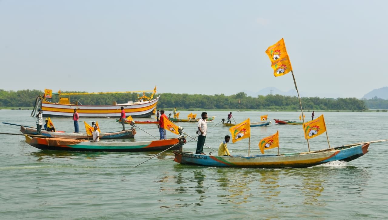 *సొసైటీ ప్రతినిధులు, మత్స్యకారులు, నాయకులు పార్టీ జెండాలు చేత బూని,నినాదాలు చేస్తూ 3 గంటల పాటు నదిపై బోట్లతో ర్యాలీ చేశారు*