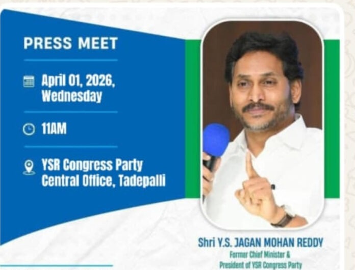 South ZoneAndhra Pradesh Ycp పార్టీ అధినేత శ్రీ వైఎస్ జగన్మోహన్ రెడ్డి గారు ప్రెస్ మీట్ By Bharat Aawaz - 1 April 2026 0 1 Share FacebookXWhatsAppLinkedinReddItPrintTelegramCopy URL శ్రీ వైఎస్ జగన్మోహన్ రెడ్డి గారు తాడేపల్లి లోని సెంటర్ ysrcp పార్టీ ఆఫీసు దగ్గర ప్రెస్ మీట్ నిర్వహించారు. రేపు అనగా ఏప్రిల్ 1st na మార్నింగ్ 11.00 గంటలకు నిర్వహించనున్నారు