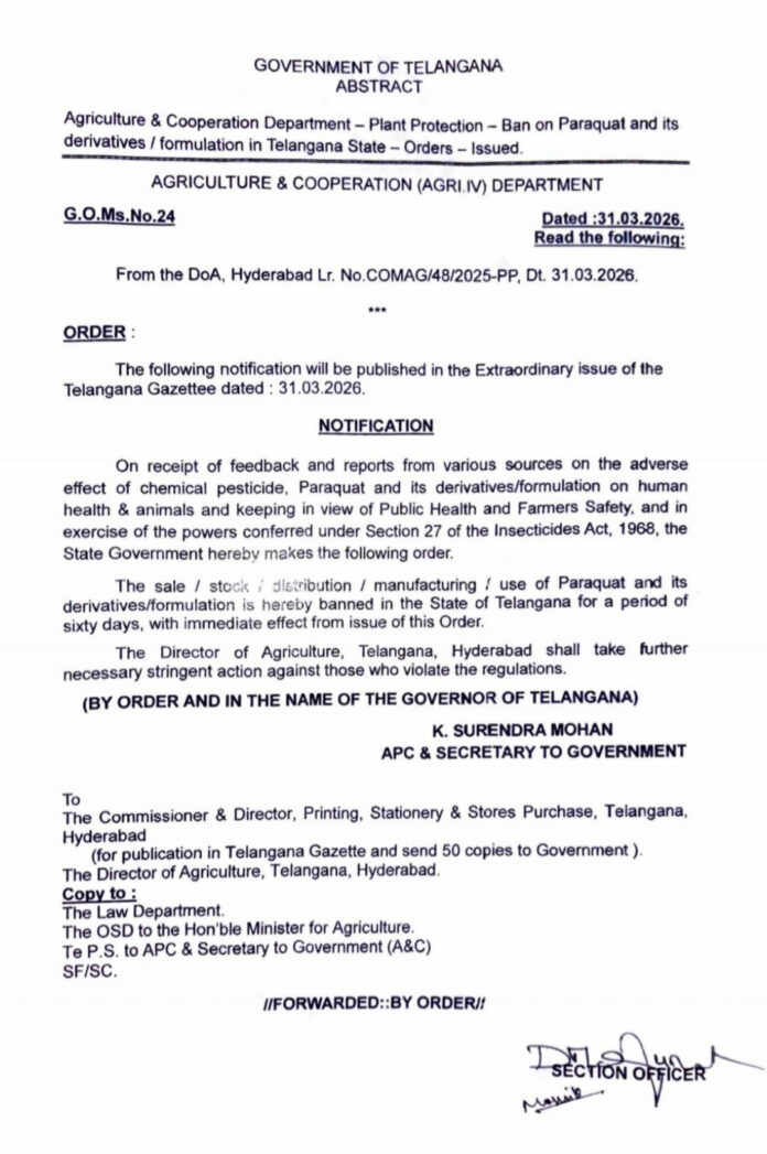 తెలంగాణ ప్రభుత్వం రాష్ట్రవ్యాప్తంగా పారాక్వాట్ (Paraquat) గడ్డిమందు పై నిషేధం విధించిన విషయం తెలియజేయబడుచున్నది.ఈ నిషేధం 31 మార్చి 2026 నుండి అమల్లోకి వచ్చినది.పారాక్వాట్ అధిక విషతత్వం కలిగిన రసాయనం కావున ఈ నిర్ణయం తీసుకోబడినది.రైతులు మరియు వ్యవసాయ కార్మికుల ఆరోగ్య భద్రత దృష్ట్యా ఈ చర్యలు చేపట్టబడినవి.