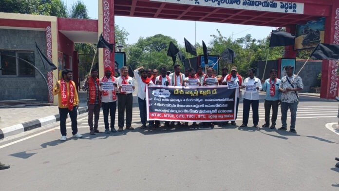 తేదీ 01/04/2026 రోజు బ్లాక్ డే సందర్భంగా పెద్దపల్లి జిల్లా కలెక్టర్ కార్యాలయం వద్ద కార్మిక సంఘాల ఆధ్వర్యంలో నల్ల జండాలు,బ్యాడ్జీలతో నిరసన ధర్నా కార్యక్రమం చేయడం జరిగింది.ఈ సందర్భంగా కార్మిక సంఘాల నాయకులు CITU జిల్లా కార్యదర్శి ఎరవెల్లి ముత్యంరావు,AITUC జిల్లా కార్యదర్శి కడారి సునీల్,బి అశోక్ లు మాట్లాడుతూ .
