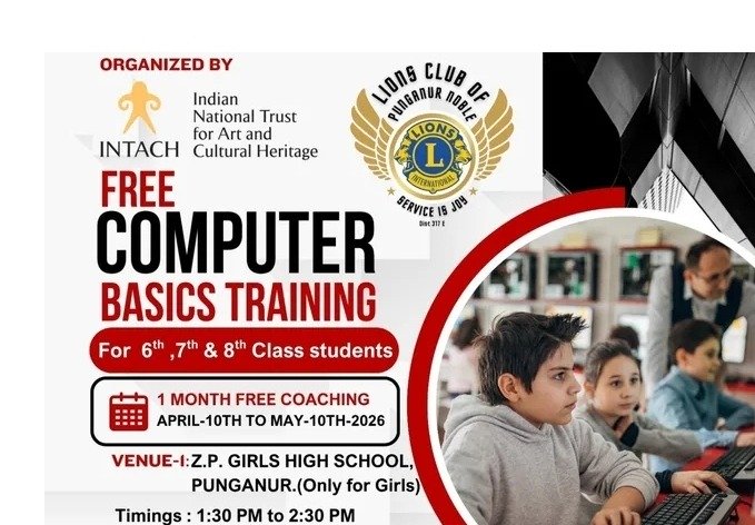 పుంగనూరులో లయన్స్ క్లబ్ మరియు ఇంటాక్ స్వచ్ఛంద సంస్థల సంయుక్త ఆధ్వర్యంలో జిల్లా ప్రభుత్వ బాలికల ఉన్నత పాఠశాల, కొత్త ఇండ్లు ప్రభుత్వ పాఠశాలల్లో ఒక నెల రోజుల పాటు ఉచిత కంప్యూటర్ శిక్షణా కార్యక్రమం నిర్వహించబడుతుంది.