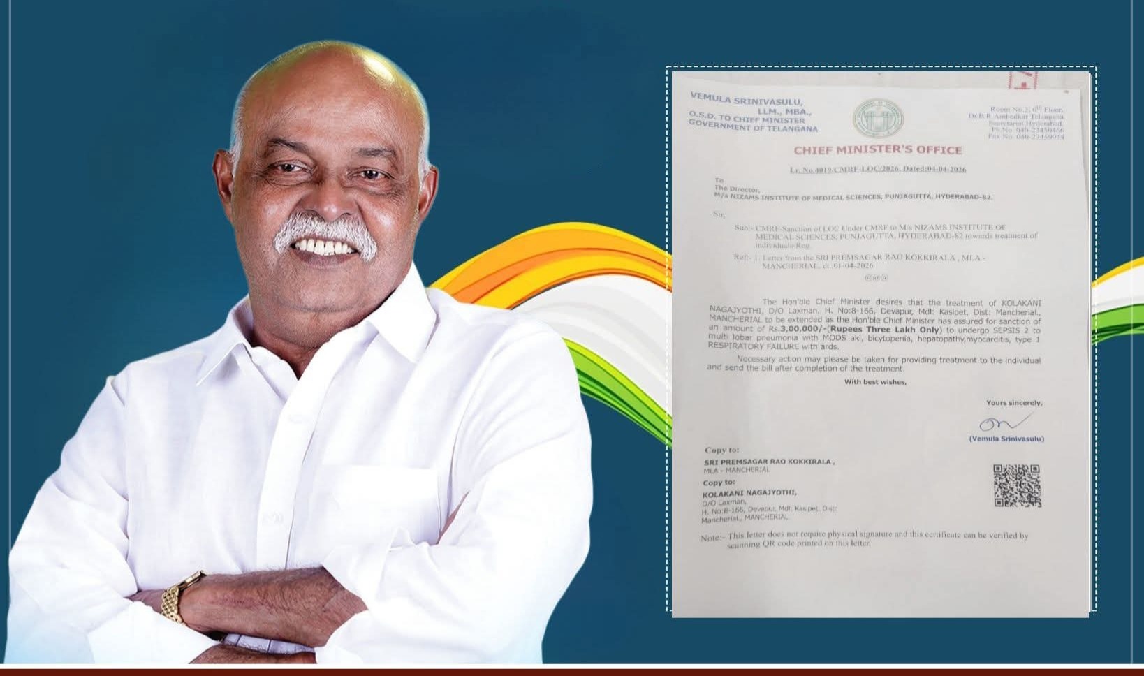 South ZoneTelangana పేద కుటుంబానికి అండగా మంచిర్యాల ఎంమ్మెల్యే : కొక్కిరాల ప్రేమ్ సాగర్ రావు By Bharat Aawaz - 8 April 2026 0 2 Share FacebookXWhatsAppLinkedinReddItPrintTelegramCopy URL మంచిర్యాల జిల్లా కాసిపేట మండలం దేవాపూర్ గ్రామానికి చెందిన కొలకని నాగ జ్యోతి గారికి ఆరోగ్య ఖర్చుల నిమిత్తం 3,00,000రూపాయల LOC ని వారి కుటుంబ సభ్యులకు అందించిన మంచిర్యాల శాసనసభ్యులు కొక్కిరాల ప్రేమ్ సాగర్ రావు