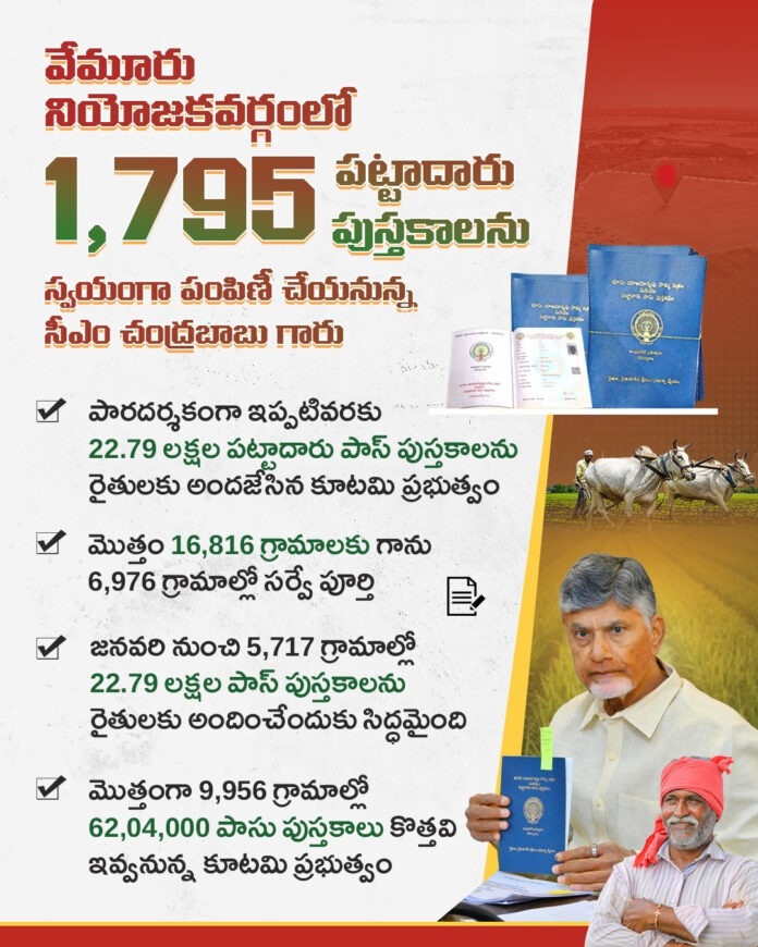 వేమూరు నియోజకవర్గంలో సీఎం చంద్రబాబుగారు తమ చేతులు మీదుగా 1,795 పట్టాదారు పుస్తకాలు పంపిణీ చేయనున్నారు. రాష్ట్రవ్యాప్తంగా ఇప్పటి వరకు పారదర్శకంగా కూటమి ప్రభుత్వం 22.79లక్షల పాస్ పుస్తకాలు పంపిణీ చేసింది. మొత్తంగా 9,956 గ్రామాల్లో 62.04లక్షల పాస్ పుస్తకాలను రాష్ట్ర ప్రభుత్వం పంపిణీ చేయనుంది.