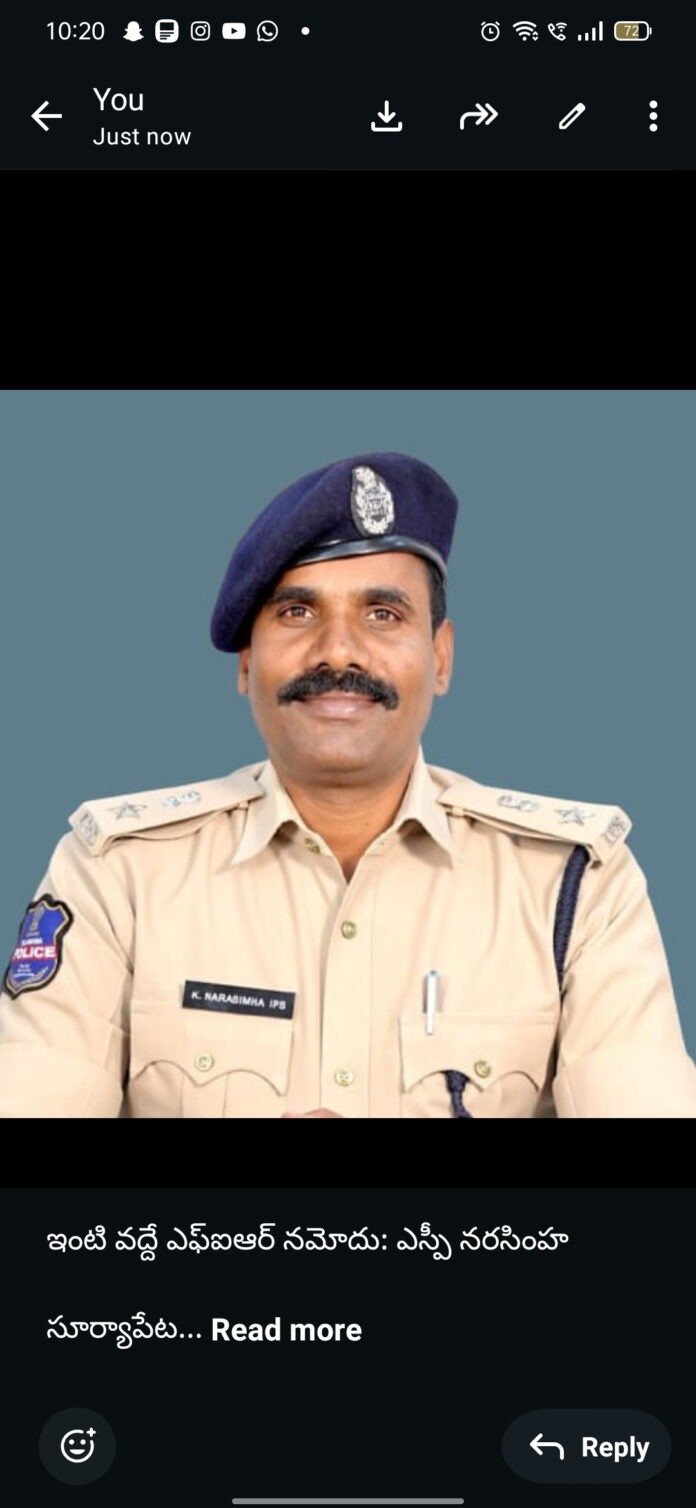 South ZoneTelangana #suryapet news By Bharat Aawaz - 9 April 2026 0 0 Share FacebookXWhatsAppLinkedinReddItPrintTelegramCopy URL ఎస్పీ నరసింహ గారు వికలాంగులకు మహిళలకు, వృద్ధులకు ఎవరైతే బాధితులు పోలీస్ స్టేషన్ కి రాకుండా తమ ఇంటివద్దనే ఎఫ్ఐఆర్ నమోదు చేసుకునేలాగా. జిల్లా ప్రజలకు భారత్ అవాజ్ పత్రిక ఛానెల్ తరుపున తెలియచేసారు..