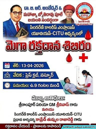 మంచిర్యాల : నస్పూర్ ప్రెస్ క్లబ్బు లో ఈనెల 13 వ తేదీన మెగా రక్తదాన శిబిరము జ్యోతిరావు పూలే మరియు అంబేద్కర్ జయంతి సందర్భంగా సింగరేణి కాలరీస్ ఎంప్లాయిస్ యూనియన్ సిఐటియు ఆధ్వర్యంలో మెగా రక్తదాన శిబిరము నిర్వహించబడుతుంది.