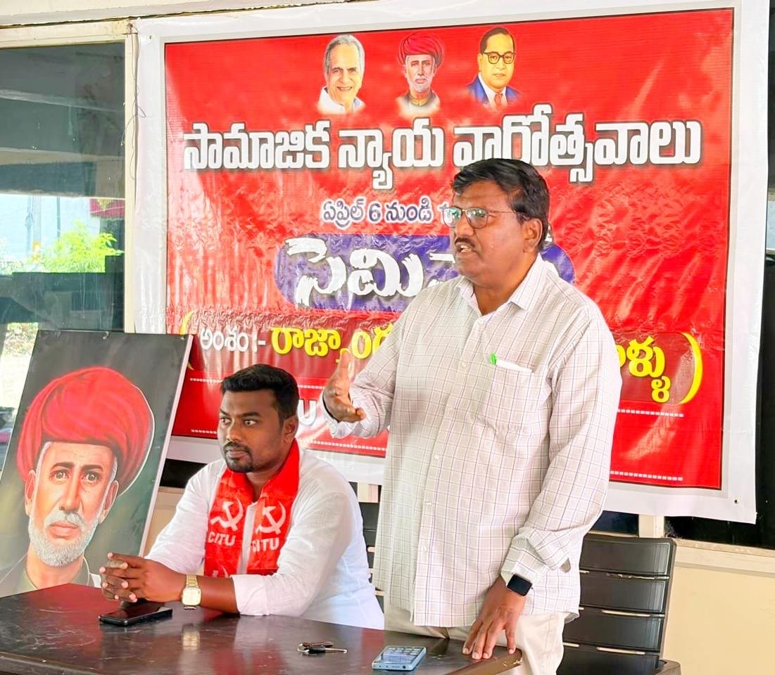 మంచిర్యాల : మంచిర్యాల జిల్లా కేంద్రంలో సీఐటీయు ఆధ్వర్యంలో రాజ్యాంగ పరిరక్షణ – సవాళ్లు అనే అంశంపై ఈ రోజు సెమినార్ నిర్వహించడం జరిగింది.ముందుగా జ్యోతిరావు పూలె గారి 199వ జయంతి నిర్వహించుకోవడం జరిగింది.8 గంటల పని,కార్మిక చట్టాలు,సామాజిక భద్రత రాజ్యాంగం ఉద్యోగులకు, కార్మికులకిచ్చిన హాక్కులు.భారత రాజ్యాంగాన్ని కాపాడు కుంటేనే హాక్కులకు రక్షణ.సామాజిక ఉద్యోగ సంఘాల జిల్లా కన్వినర్ రంగు రాజేశం మాట్లాడుతూ.సీఐటీయు మంచిర్యాల జిల్లా కమిటీ ఆధ్వర్యంలో సామాజిక న్యాయ వారోత్సవాల సందర్బంగా శనివారం రోజున పట్టణంలోని పూలె భవనంలో మహాత్మజ్యోతి రావు పూలే 199వ జయంతి ని ఘనంగా నిర్వహించడం జరిగింది.అనంతరం దుంపల రంజిత్ కుమార్ సీఐటీయు జిల్లా కార్యదర్శి అధ్యక్షతన రాజ్యాంగ పరిరక్షణ – సవాళ్లు అనే అంశం పై సెమినార్ నిర్వహించడం జరిగింది. వక్తలు *సామజిక, ఉద్యోగ సంఘాల జిల్లా కన్వినర్ రంగు రాజేశం, డాక్టర్ చంద్రశేఖర్ గార్లు మాట్లాడుతూ. జ్యోతిరావు పూలె 1827, ఏప్రిల్ 11న మహారాష్ట్రలోని సతారా జిల్లాలో గోవింద రావ్ పూలె,చిమ్నాబాయి దంపతుల ఇంట జన్మించాడు.ఓసారి స్నేహితుడి ఇంట పెళ్లికి వెళ్లినప్పుడు కులం పేరుతో జరిగిన అవమానం జ్యోతిరావ్ పూలే జీవితాన్ని మలుపు తిప్పింది. కులవివక్షకు వ్యతిరేకంగా, స్త్రీ విద్యను ప్రోత్సహిస్తూ అణగారిన వర్గాల అభ్యున్నతికి కృషి చేశారు.భారత రాజ్యాంగంపై ప్రమాణం చేసిన నేటి కేంద్రంలోని బీజేపీ పాలకులు అధికారం ఉన్న రాష్టాలల్లో మహిళలపై దాడులు అత్యాచారాలు రోజు రోజుకు పెరుగుతున్నాయి.8 గంటల పని విధానం, కార్మిక చట్టాలను రద్దు చేయ్యడం.ప్రభుత్వ భూములను,ప్రకృతి సంపదను కార్పొరేట్ సంస్థలకు కట్టబెట్టడడం జరిగింది.అంతే కాకుండా భారత రాజ్యాంగాన్ని మర్చివేసి మణుధర్మంను అమలు చేయాలని కుట్ర చేస్తుంది. మరో వైపు అంబేద్కరిస్టులు, కమ్యూనిస్టులపై,సామాజిక సంఘాల పై దాడులకు పునుకుంటుంది. పెట్టుబడిరులకు అనుకాలంగా శ్రామికుల, కార్మికుల హక్కులపై తీవ్రమైన దాడులు చేస్తుంది.దేశంలోని పెట్టుబడిదారులకు లాభాలు చేకూర్చాడానికి కార్మికులను బానిసలుగా మారుస్తుంది. కేంద్ర బీజేపీ ప్రభుత్వం అనుసరిస్తున్న విధానాలకు వ్యతిరేకంగా, కుల నిర్ములనకు వ్యతిరేకంగా పోరాటం, చేయడమే జ్యోతిరావు పూలే గారి ఆశయలను ముందుకు తీసుకెళ్లినవాళ్ళం అవుతాము.ఈ కార్యక్రమంలో సంకె రవి సీఐటీయు జిల్లా ఉపాధ్యక్షులు,దూలం శ్రీనివాస్,సాంబారి వెంకటస్వామి జిల్లా సహాయ కార్యదర్శులు , జిల్లా కమిటీ సభ్యులు పద్మావతి, స్వాతి, రాణి, గోమాస ప్రకాష్ సీఐటీయు నాయకులు రాందాస్, సాగర్ రెడ్డి, వెంకటేష్, అంజి, ప్రవీణ, బ్రహ్మయ్య వ్యకస జిల్లా ఉపాధ్యక్షులు,కే.ప్రేమ్ కుమార్ డివైఎఫ్ఐ జిల్లాఉపాధ్యక్షులు, ద