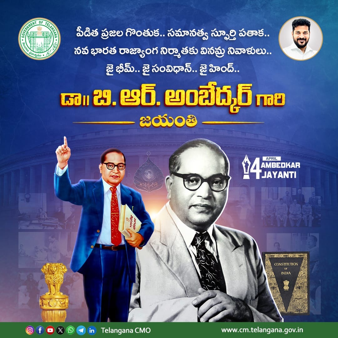 రాజ్యాంగ నిర్మాత, భారతరత్న డాక్టర్ బాబాసాహెబ్ అంబేద్కర్ గారి జయంతి సందర్భంగా ముఖ్యమంత్రి శ్రీ ఎ. రేవంత్ రెడ్డి గారు ప్రజలందరికీ హృదయపూర్వక శుభాకాంక్షలు తెలిపారు. సమానత్వం, స్వేచ్ఛ, సౌభ్రాతృత్వం అనే మహత్తర విలువలను మన రాజ్యాంగం ద్వారా అందించిన మహనీయుడని ఆయన కొనియాడారు. డాక్టర్ బీఆర్ అంబేద్కర్ గారు చూపిన మార్గం సమాజానికి ఎల్లప్పుడూ దిశానిర్దేశం చేస్తూనే ఉంటుందని పేర్కొన్నారు.