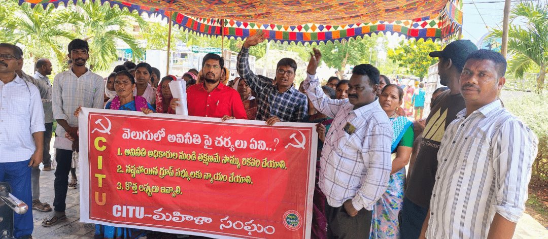 చింతూరు మండలంలో ‘వెలుగు‘ (ఇందిరా క్రాంతి పథకం) ద్వారా జరిగిన భారీ అవినీతిపై సీఐటీయూ, గిరిజన మరియు మహిళా సంఘాలు గళమెత్తాయి. సుమారు 1.30 కోట్ల రూపాయల నిధులు పక్కదారి పట్టాయని, తక్షణమే ఆ సొమ్మును రికవరీ చేసి బాధితులకు న్యాయం చేయాలని డిమాండ్ చేస్తూ చింతూరు ఐటీడీఏ కార్యాలయం ముందు నిరసన చేపట్టారు.