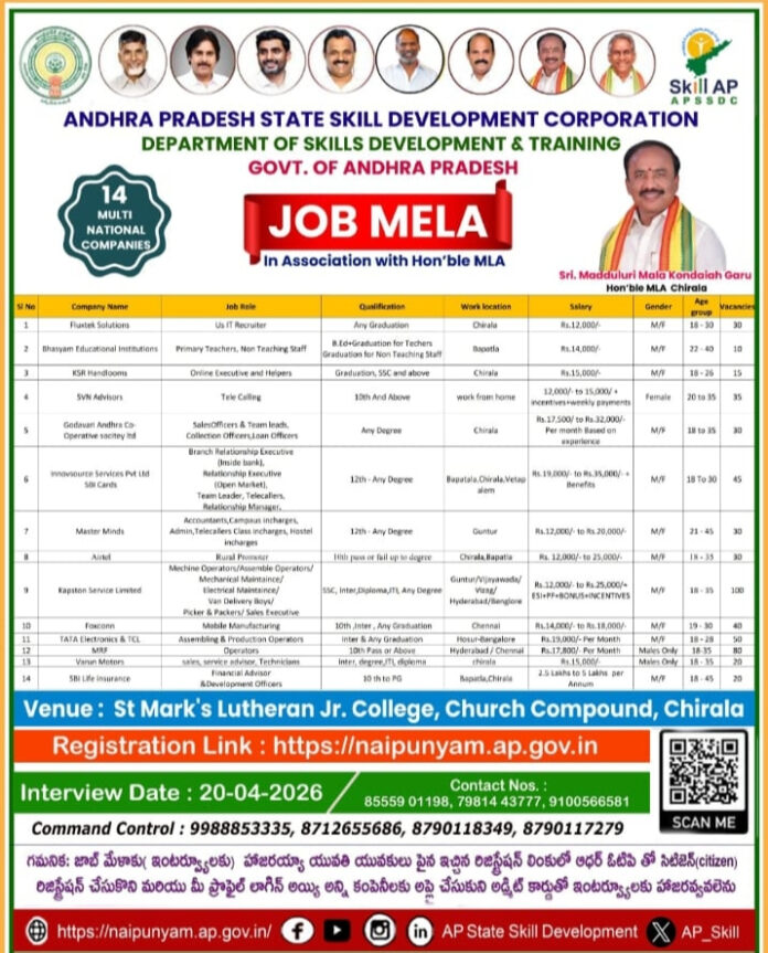 చీరాలలోని సెయింట్ మార్క్స్ లూథరన్ జూనియర్ కాలేజ్ చర్చ్ కాంపౌండ్‌లో ఏప్రిల్ 20, 2026 (సోమవారం) ఉదయం 9 గంటల నుండి ఈ జాబ్ మేళా ప్రారంభం కానుంది. ఈ విషయాన్ని కళాశాల ప్రిన్సిపల్ గారపాటి పుష్ప రాజు వెల్లడించారు.
