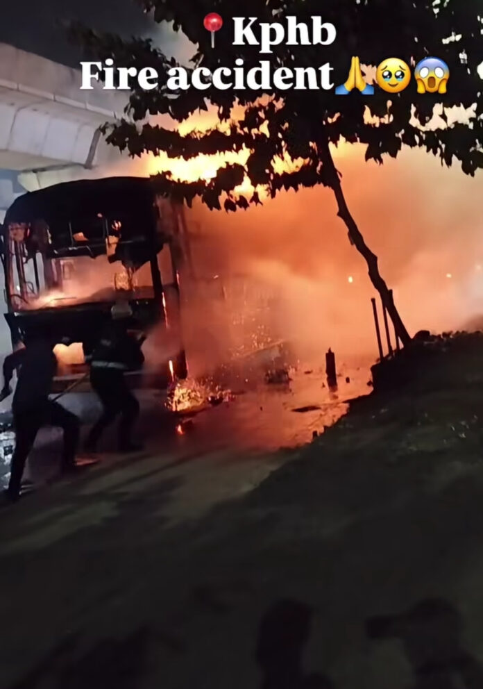 Fire accident helf at kphb yesterday night. Its a private travels bus ( Hyderabad to palakollu) moving towards sr nagar. This incident has happenend.