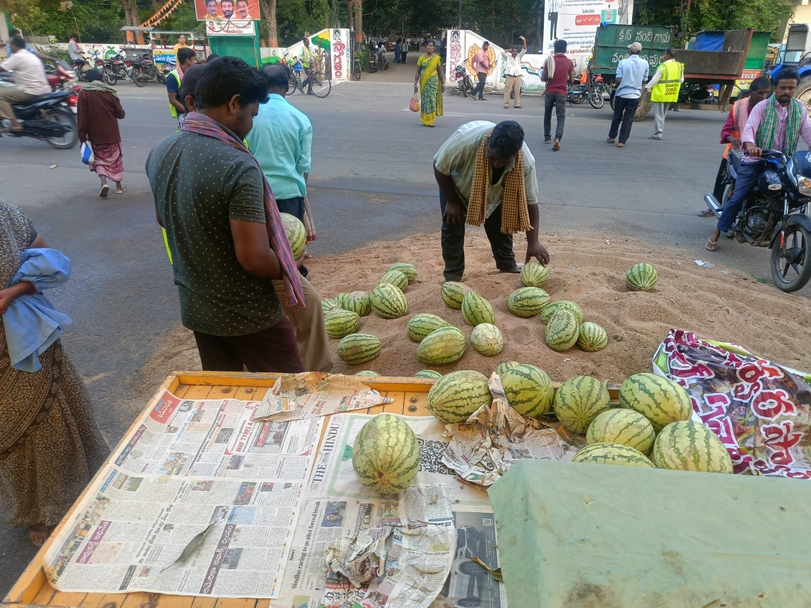 ఉదయం పుచ్చకాయ లను పంపిణీ చేశారు. ఈ సందర్భంగా షాపు యజమాని స్వయంగా పుచ్చకాయ లను కార్మికులకు నచ్చిన కాయలను అందజేశారు.